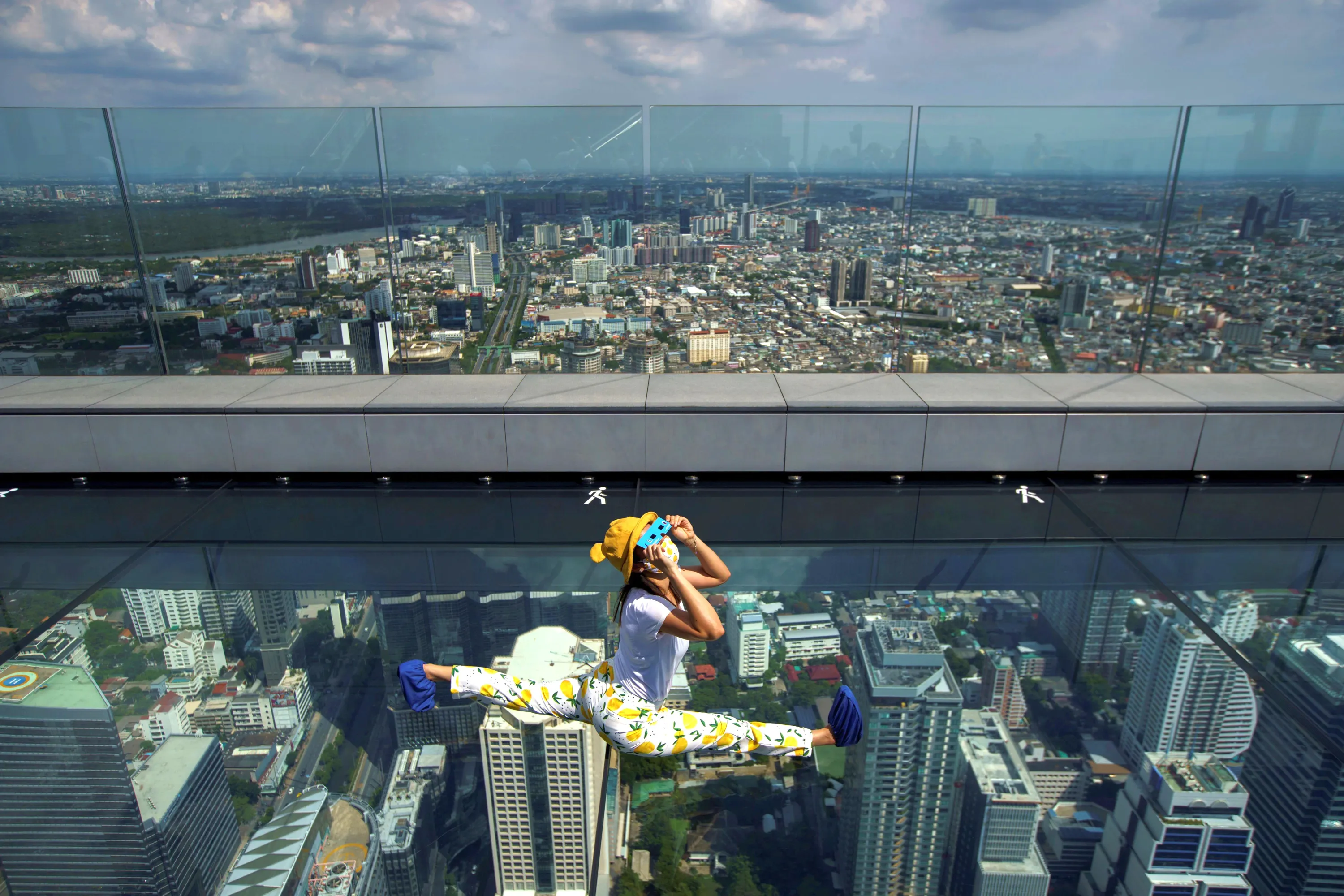 A woman wearing a face mask amid the spread of the coronavirus disease (COVID-19) observes a partial solar eclipse on the Mahanakhon Skywalk Glass Tray at the King Power Mahanakhon building in Bangkok, Thailand, June 21, 2020. (Photo by Athit Perawongmetha/Reuters)