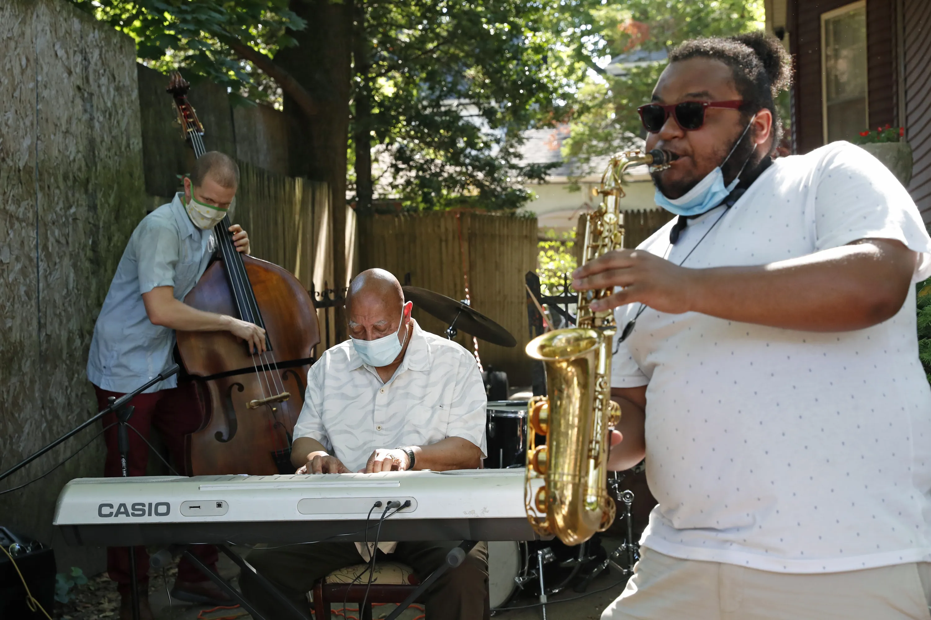 Elijah Herring, right, plays the sax while performing with keyboardist Kenny Barron, center, and bassist Dan Loomis, during Make Music-New York in Brooklyn's Ditmas Park neighborhood during the coronavirus outbreak, Sunday, June 21, 2020, in New York. The concert was one of seven simultaneously performed live jazz, classical and rock performances offered from the driveways, porches and balconies of Victorian homes in the neighborhood. (Photo by Kathy Willens/AP Photo)