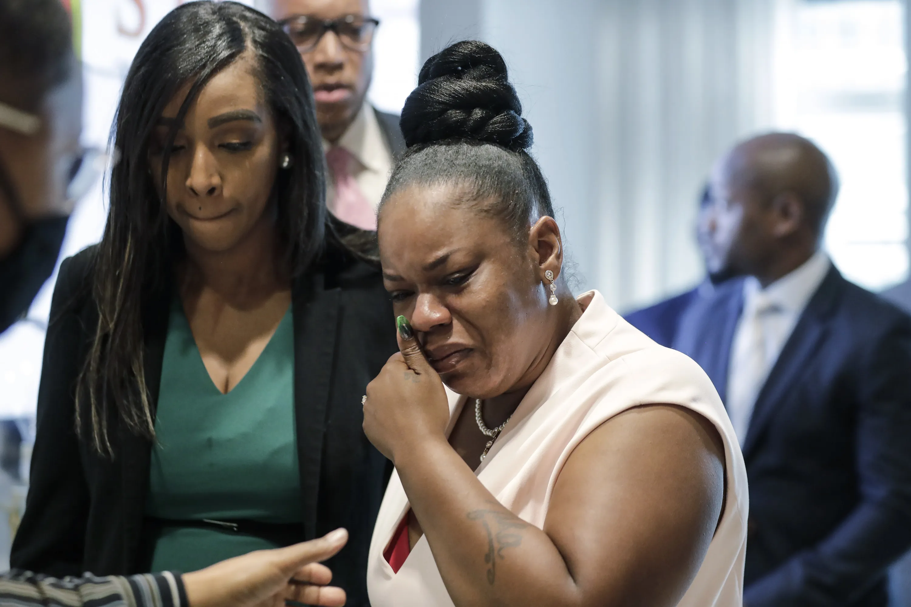 Tomika Miller, center, widow of Rayshard Brooks cries as she leaves a news conference, Wednesday, June 17, 2020 in Atlanta. Fulton County District Attorney Paul L. Howard Jr. announced former Atlanta Police Officer Garrett Rolfe faces charges including felony murder in the fatal shooting of Rayshard Brooks on June 12. (Photo by Brynn Anderson/AP Photo)