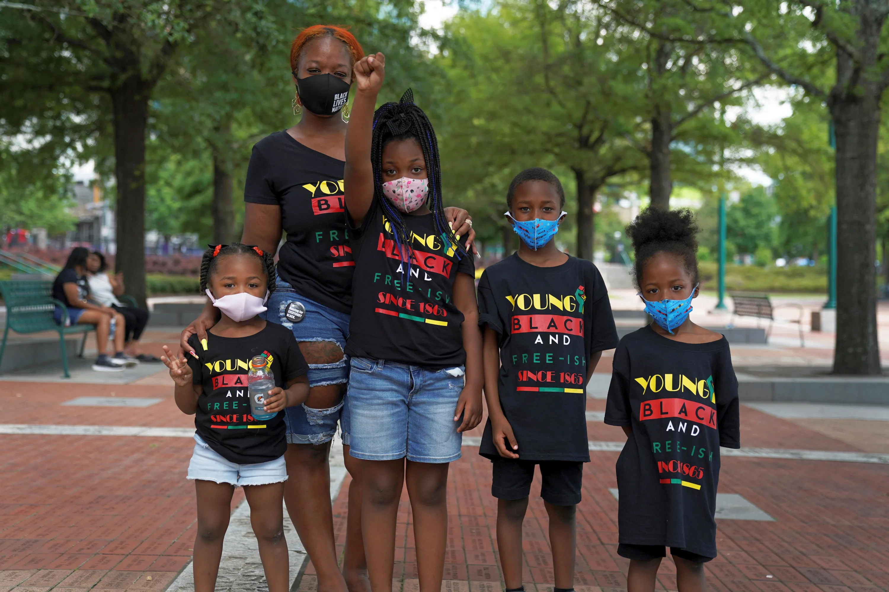A woman and children wearing face masks pose for a picture as people take part in an event to mark Juneteenth, which commemorates the end of slavery in Texas, two years after the 1863 Emancipation Proclamation freed slaves elsewhere in the United States, amid nationwide protests against racial inequality, in Atlanta, Georgia, U.S. June 19, 2020. (Photo by Elijah Nouvelage/Reuters)