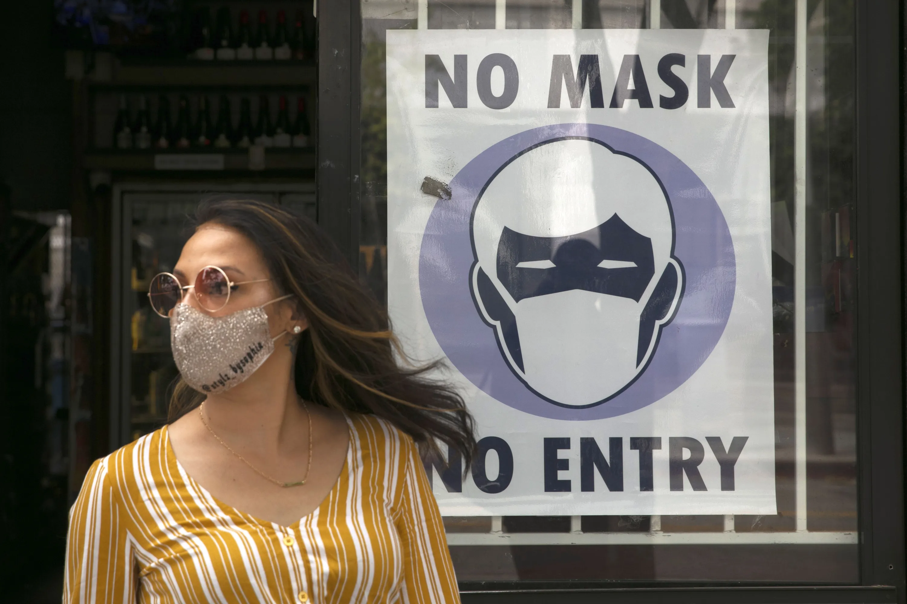 A woman walks out of a liquor store past a sign requesting its customers to wear a mask Tuesday, June 23, 2020, in Santa Monica, Calif. The state Department of Public Health recorded more than 5,000 new cases Tuesday, putting the total number of positive cases at more than 183,000. The state has seen more than 5,500 deaths related to COVID-19. (Photo by Jae C. Hong/AP Photo)