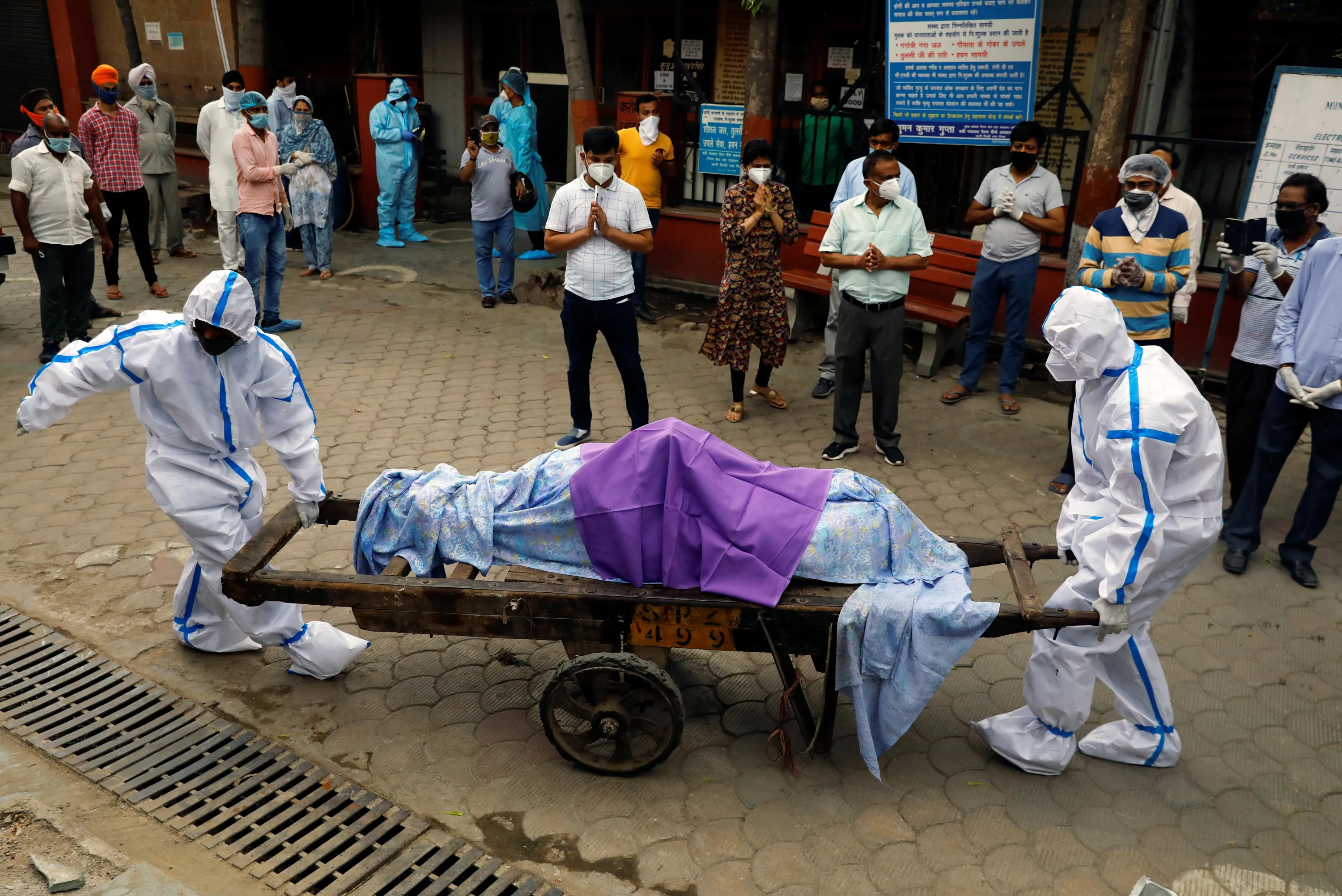 Health workers wearing Personal Protective Equipment (PPE) carry the body of a person who who died due to the coronavirus disease at a crematorium in New Delhi, India, June 24, 2020. (Photo by Anushree Fadnavis/Reuters)