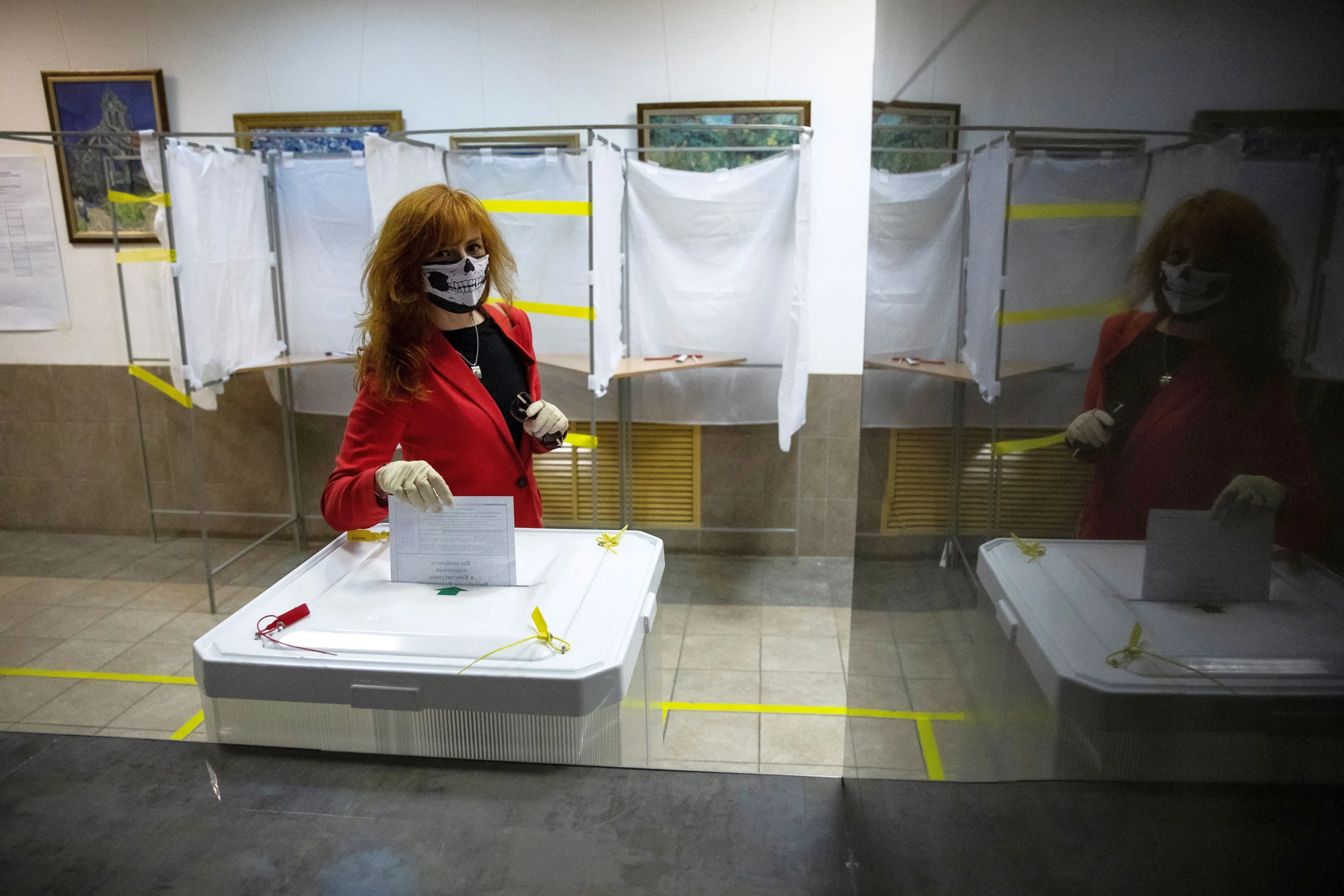 A voter wearing a face mask to protect against coronavirus casts her ballot at a polling station in Moscow, Russia, Monday, June 29, 2020. Polls opened in Russia on June 25 for a week-long vote on a constitutional reform that would allow President Vladimir Putin to stay in power until 2036. (Photo by Pavel Golovkin/AP Photo)