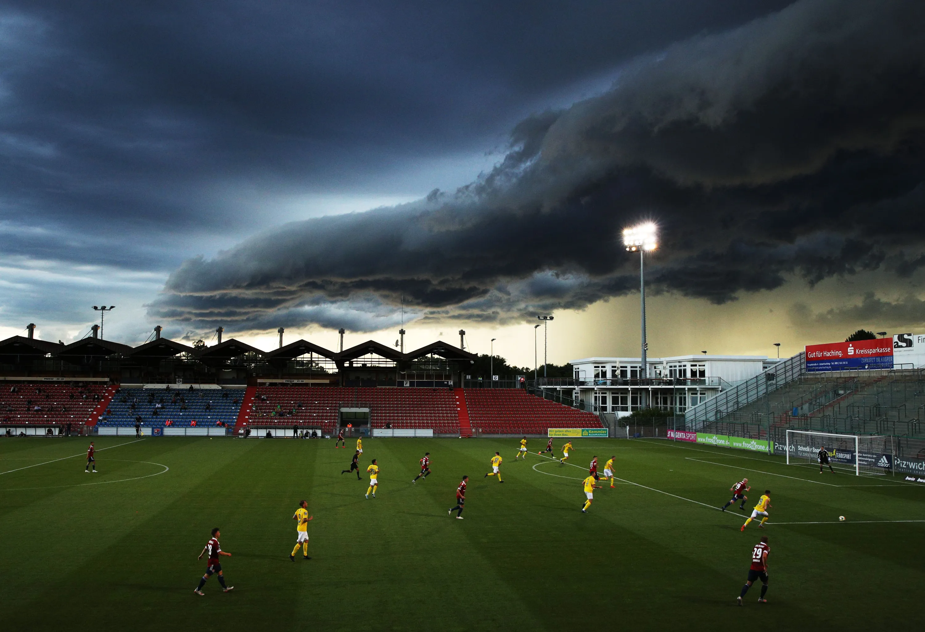 Maximilian Krauss of SpVgg Unterhaching makes a run while a massive shelf cloud rolls in during the 3. Liga match between SpVgg Unterhaching and FC Carl Zeiss Jena at Alpenbauer Sportpark on July 01, 2020 in Unterhaching, Germany. (Photo by Adam Pretty/Bongarts/Getty Images)