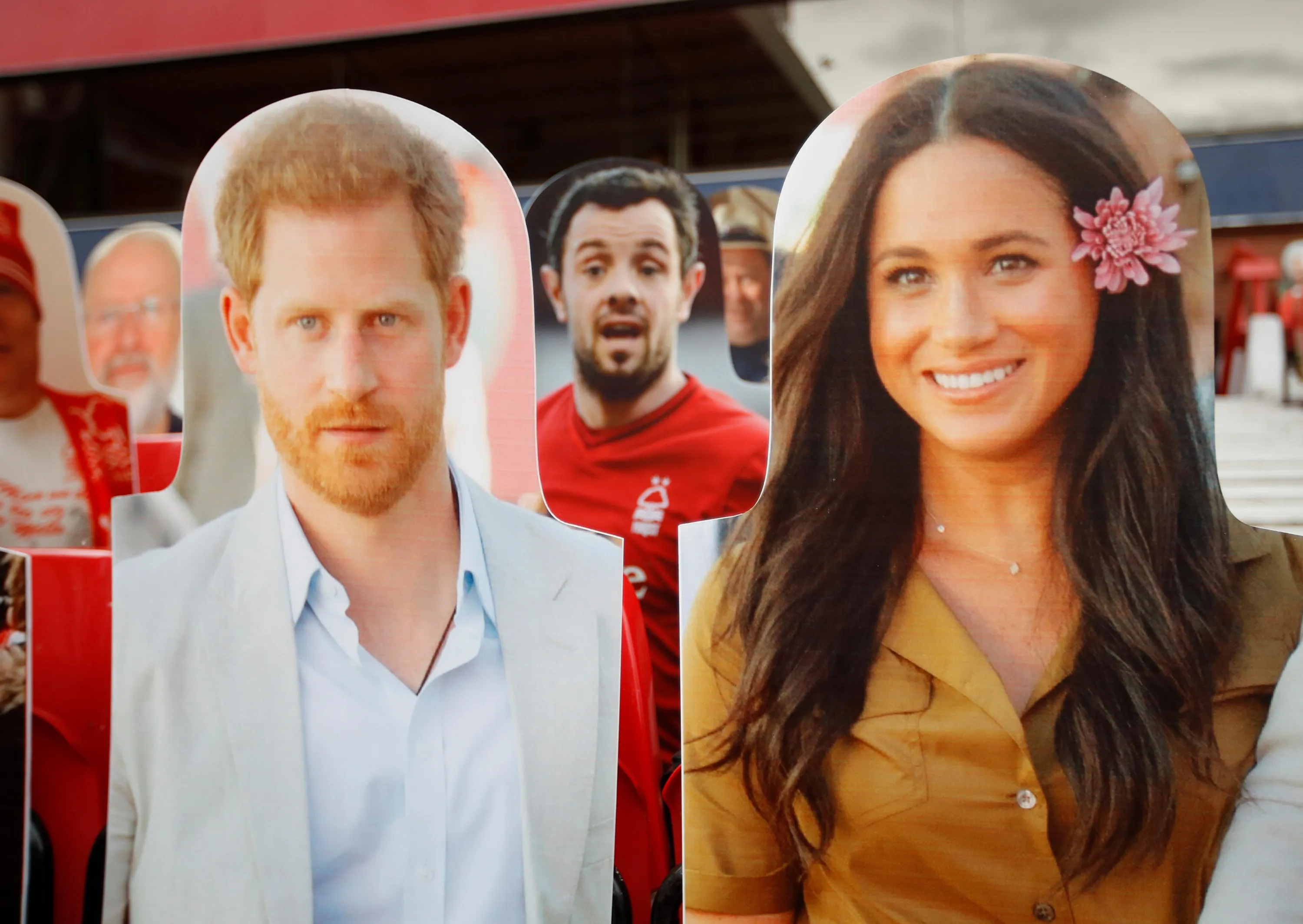 A cut out fan photograph of Prince Harry and Meghan Markle in between former Nottingham Forest player Andy Reid, as play Nottingham Forest v Swansea City resumes behind closed doors following the outbreak of the coronavirus disease (COVID-19) in Nottingham, Britain on July 15, 2020. (Photo by Andrew Boyers/Action Images via Reuters)