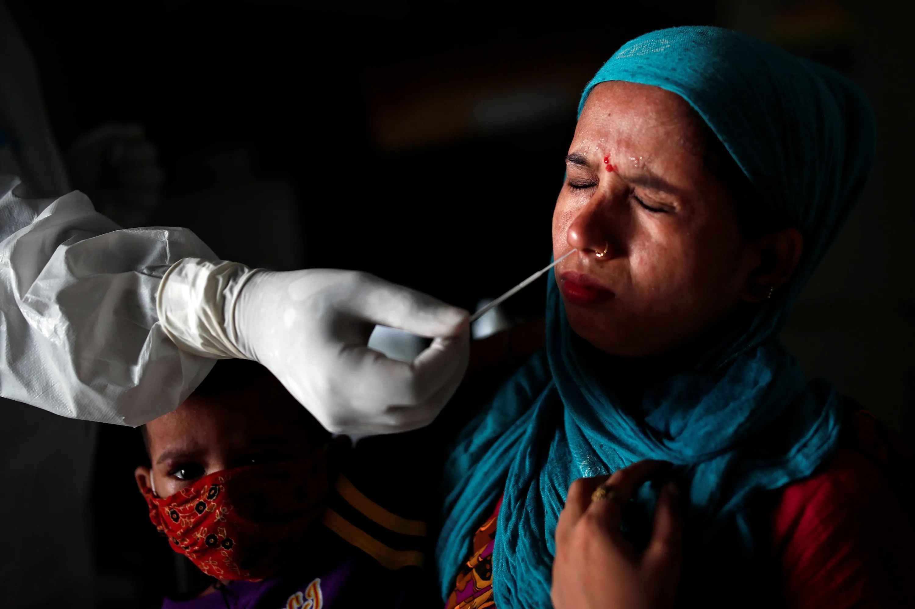 A medical health worker collects a sample from a woman using a swab, at a local health centre to conduct tests for the coronavirus disease (COVID-19), amidst the spread of the disease, in New Delhi, India July 28, 2020. (Photo by Adnan Abidi/Reuters)
