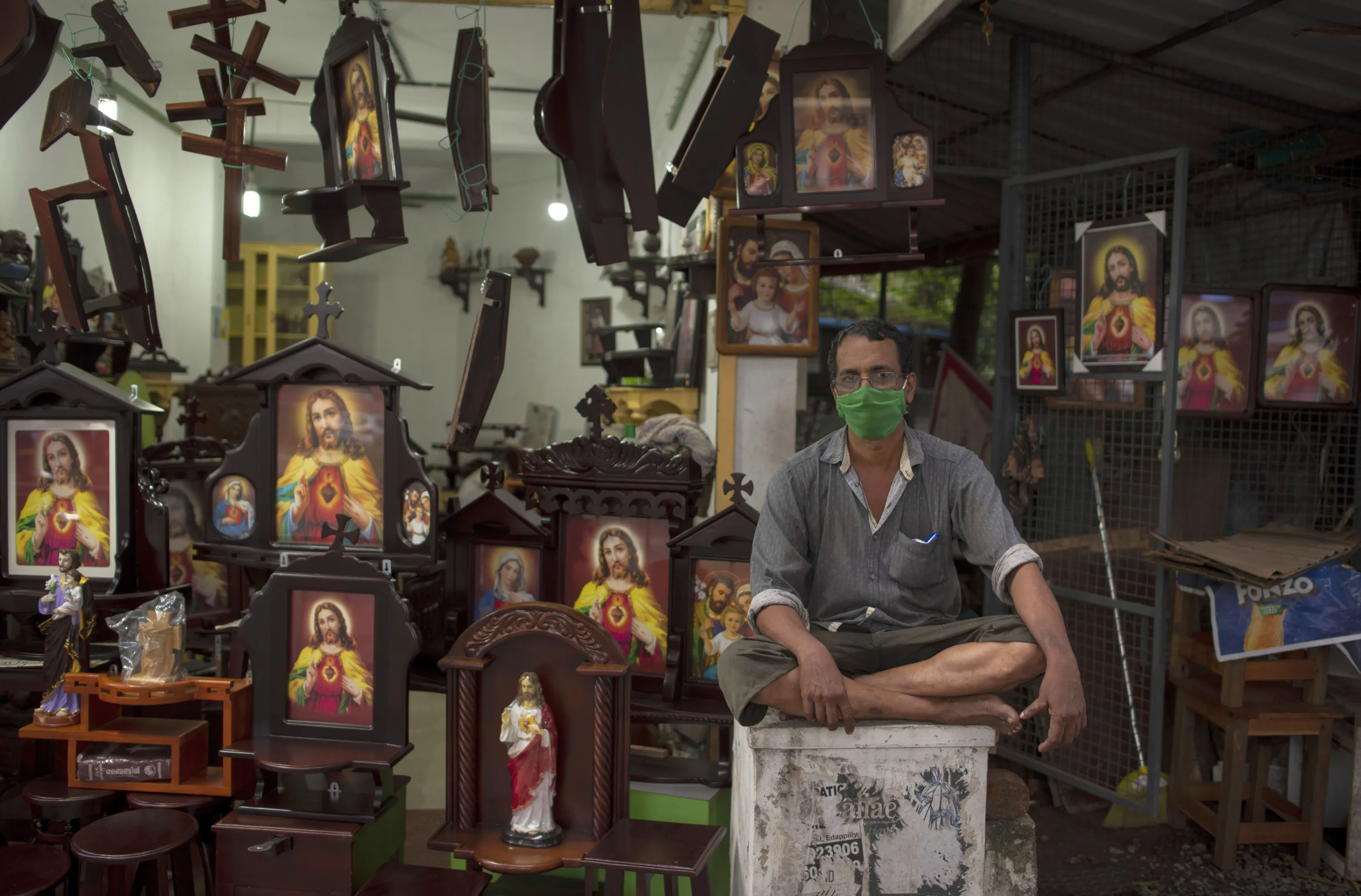 Josy, a man who sells images of Jesus Christ, wears a mask as a precaution against the coronavirus as he waits for customers in Kochi, Kerala state, India, Friday, July 31, 2020. India is the third hardest-hit country by the COVID-19 pandemic in the world after the United States and Brazil. (Photo by R.S. Iyer/AP Photo)