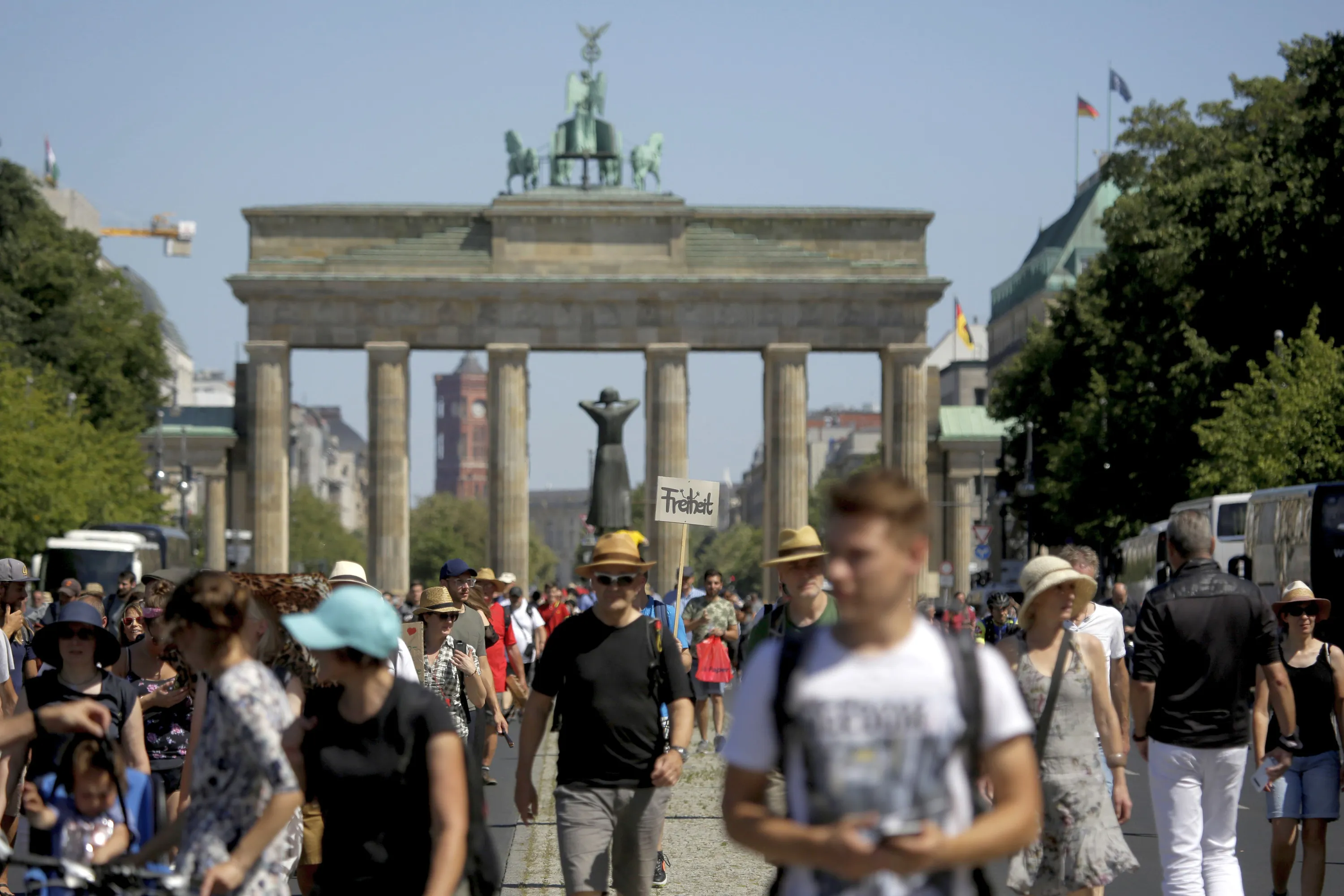 A demonstrator carries a sign reading “Freedom” in front of the Brandenburg gate as he attends a demonstration with the slogan “The end of the pandemic – freedom day” – against coronavirus restrictions in Berlin, Germany, Saturday, August 1, 2020. (Photo by Markus Schreiber/AP Photo)