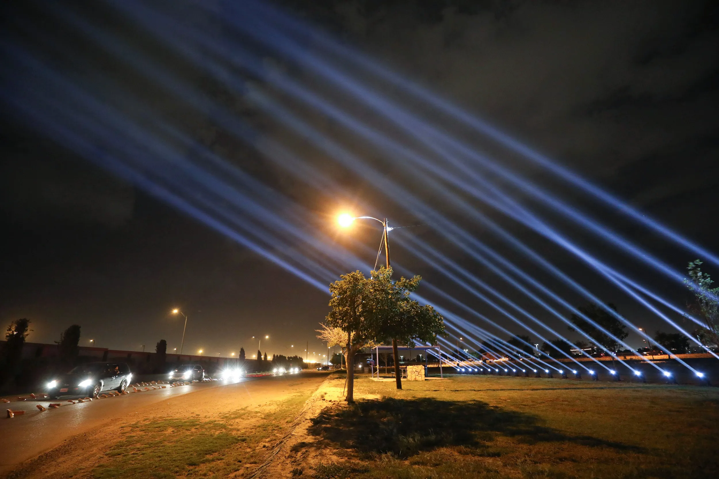 Twenty three lights shine as people in cars (L) attend a drive-through luminaria remembrance honoring the one year anniversary of the Walmart shooting which left 23 people dead in a racist attack targeting Latinos on August 2, 2020 in El Paso, Texas. August 3rd marks the first anniversary of the deadliest attack against Hispanics in modern U.S. history. A number of memorial events are planned amid the COVID-19 pandemic in the Texas city which sits along the U.S.-Mexico border. (Photo by Mario Tama/Getty Images)