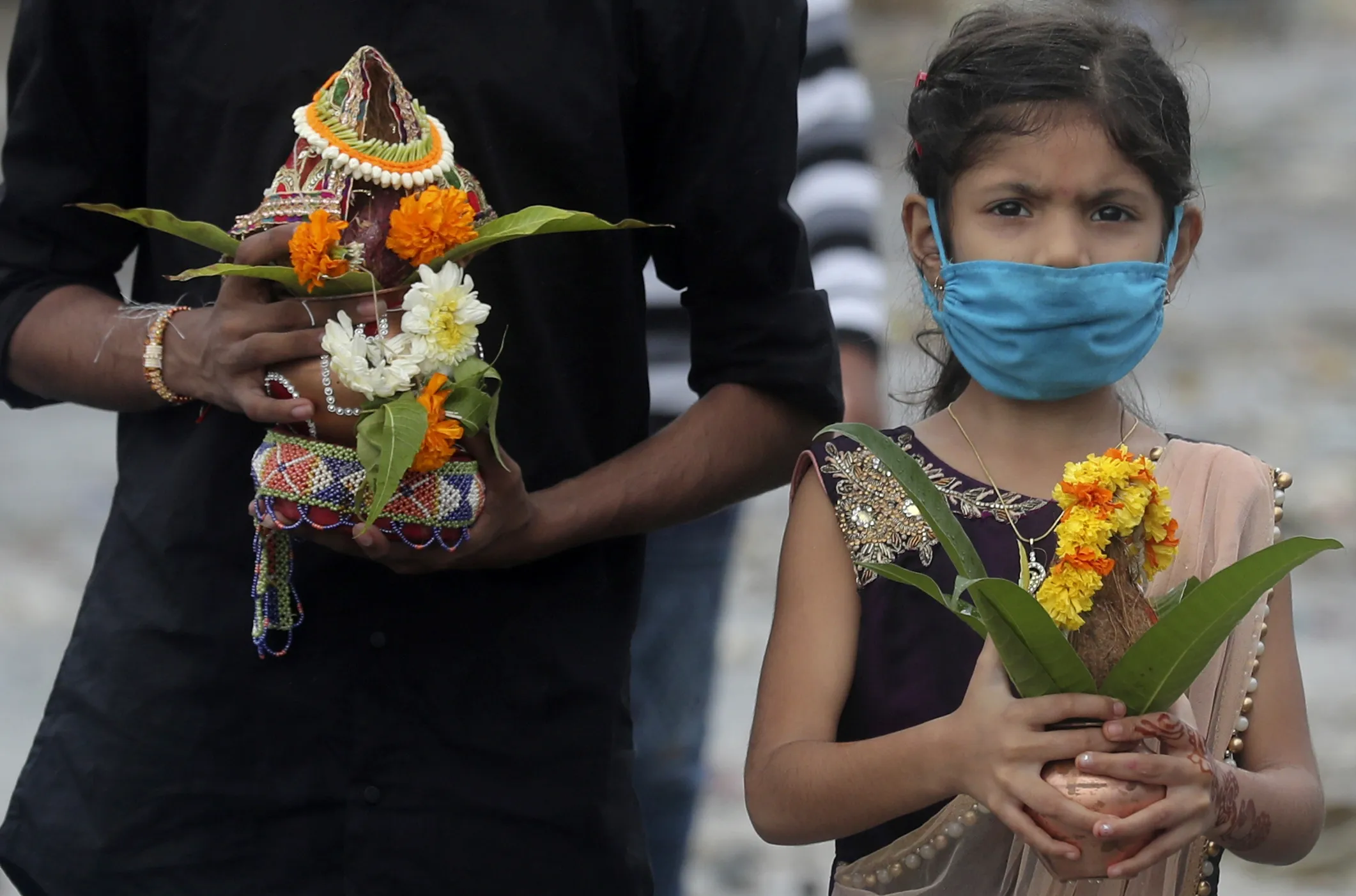 A girl wears a mask as members of the fishing community offer prayers during Narali Purnima festival on the Arabian Sea coast in Mumbai, India, Monday, August 3, 2020. Narali Purnima also known as Coconut Day, is celebrated majorly by the fishing community in the western coastal regions of India. (Photo by Rafiq Maqbool/AP Photo)