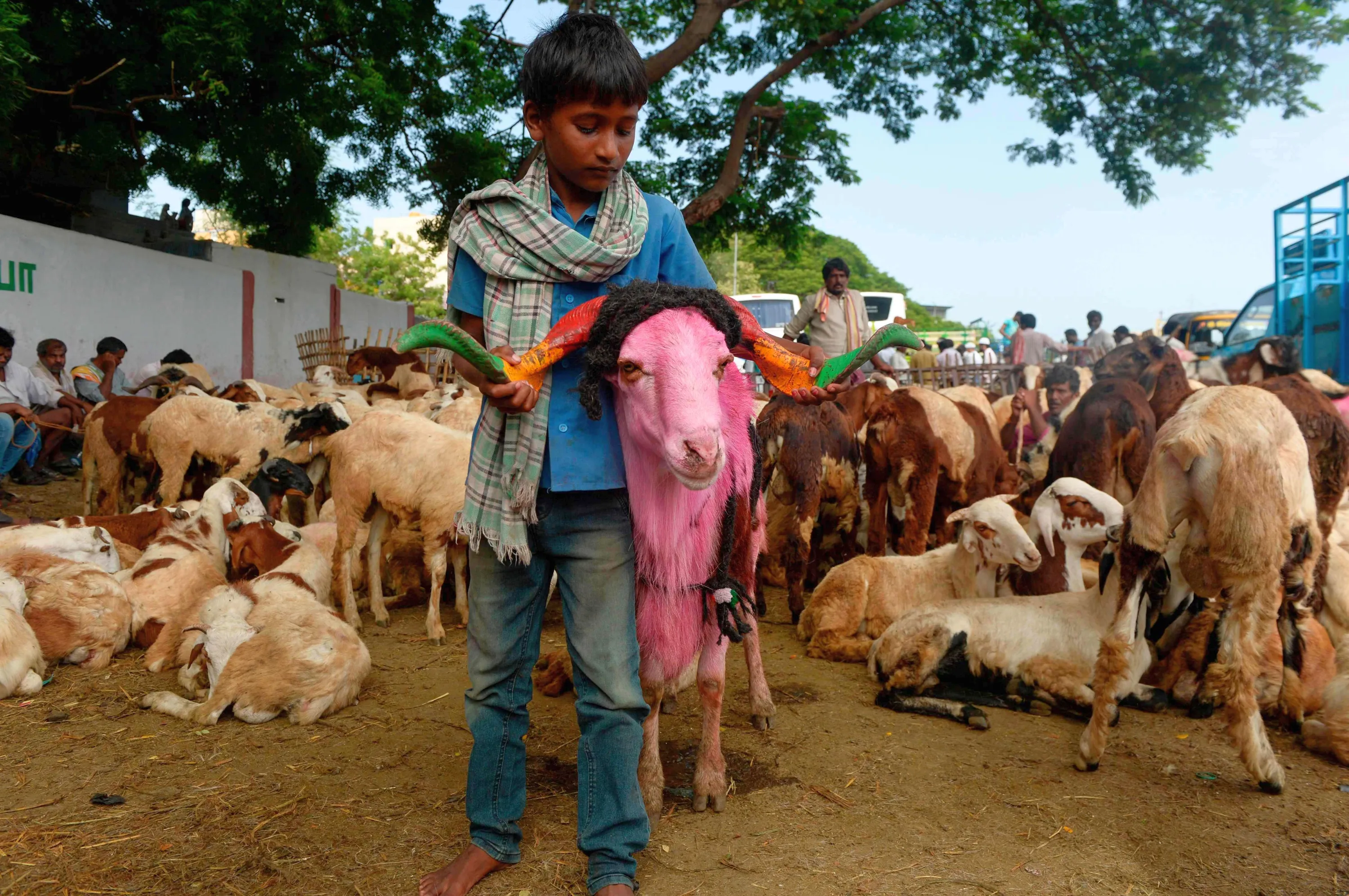 A young livestock vendor displays his sheep at a make-shift market set up ahead of the Muslim festival of Eid al-Adha in Chennai, India on August 11, 2019. Muslims across the world are preparing to celebrate the annual festival of Eid al-Adha, or the Festival of Sacrifice, which marks the end of the Hajj pilgrimage to Mecca and in commemoration of Prophet Abraham's readiness to sacrifice his son to show obedience to God. (Photo by Arun Sankar/AFP Photo)