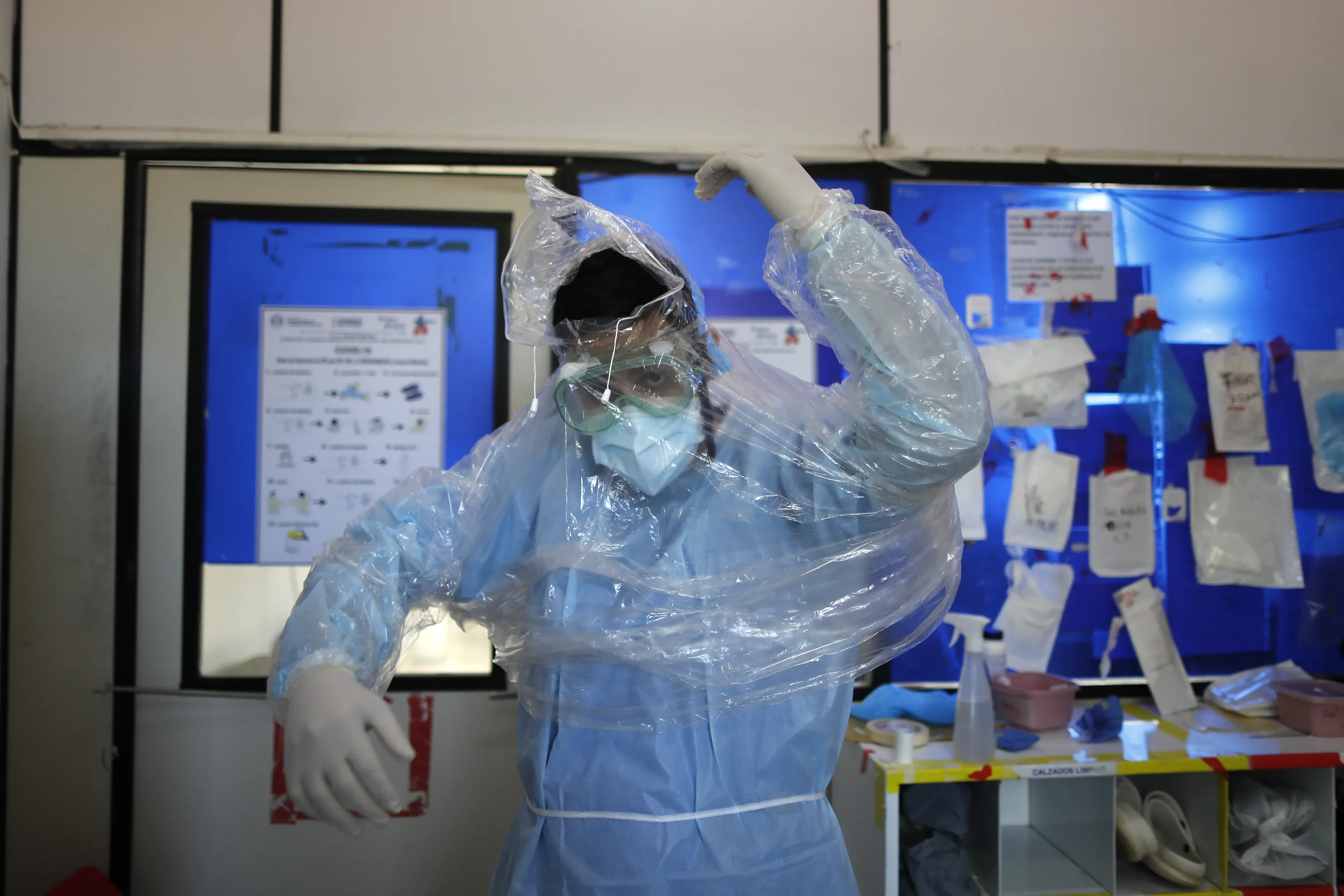 A nurse puts on protective gear before entering the intensive care unit dedicated to COVID-19 at the Ineram Hospital in Asuncion, Paraguay, Friday, August 21, 2020. In the past month, the number of people who have died of COVID-19 in Paraguay has multiplied by five, according to numbers released by the Health Ministry. (Photo by Jorge Saenz/AP Photo)