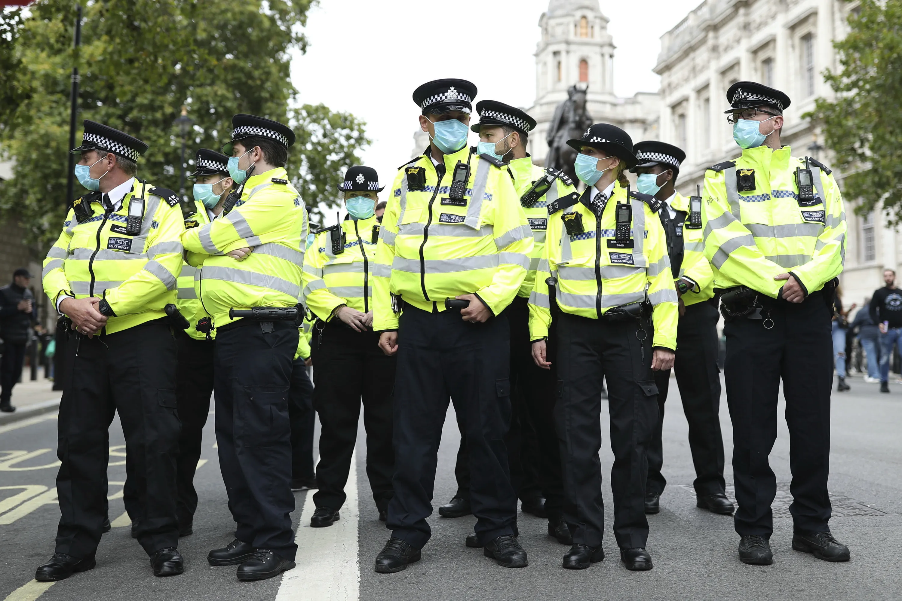 Police officers wearing face masks stand guard during a protest opposed to COVID-19 pandemic restrictions, in Trafalgar Square, London, Saturday, August 29, 2020. (Photo by Yui Mok/PA Wire via AP Photo)