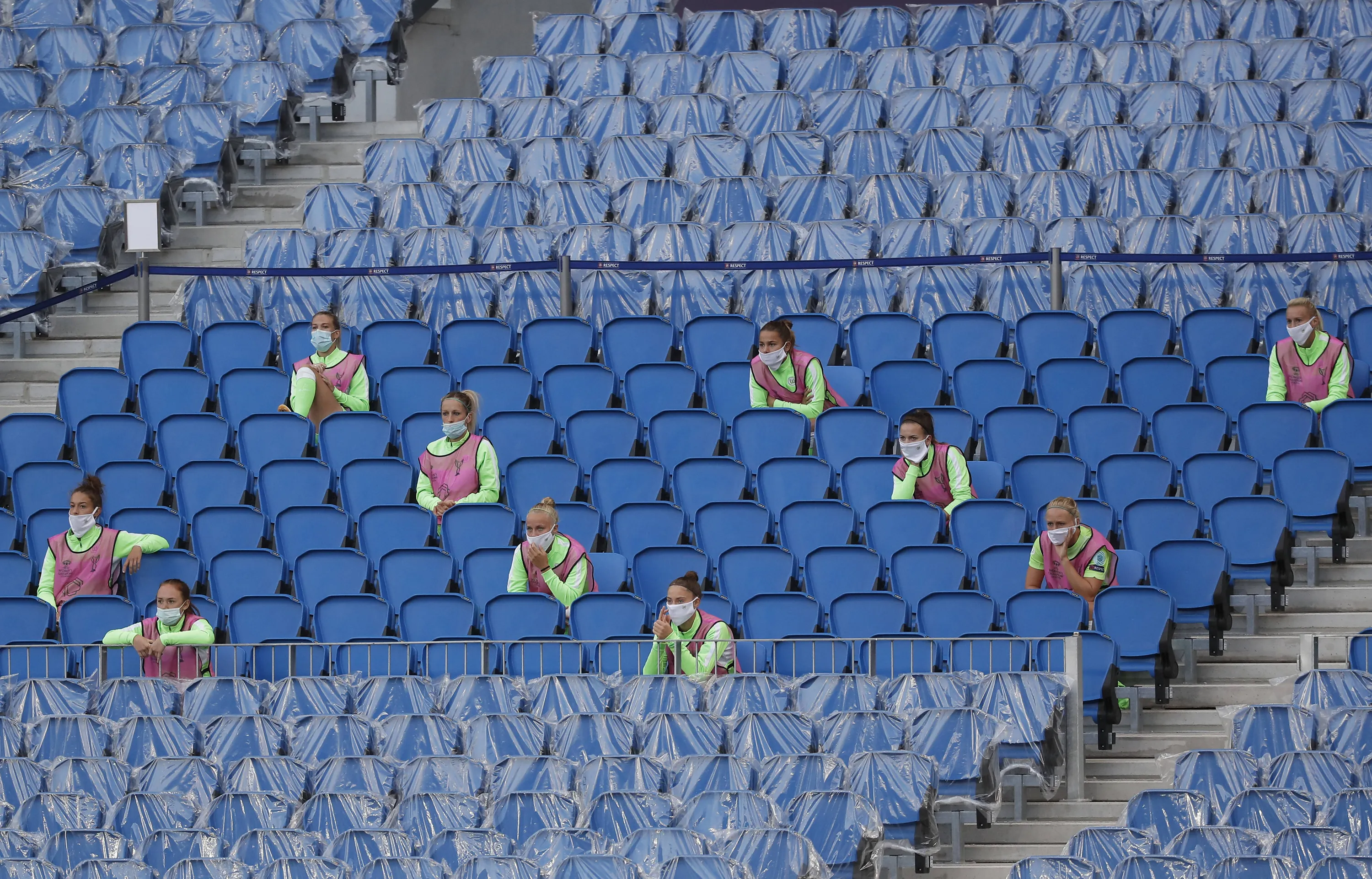 Wolfsburg players sit in the stands during the Women's Champions League final soccer match between Wolfsburg and Lyon at the Anoeta stadium in San Sebastian, Spain, Sunday, August 30, 2020. (Photo by Villar Lopez/Pool via AP Photo)