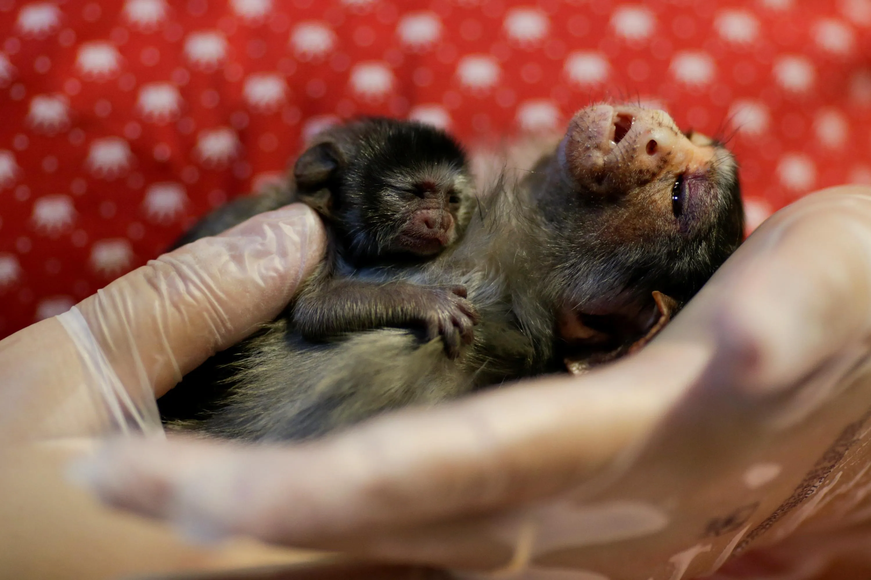 Veterinarian Carine Hanna takes care of Xita, a Rondon's marmoset, who was rescued by the state environmental police after giving birth, at the Clinidog veterinary clinic, in Porto Velho, Rondonia State, Brazil, August 24, 2020. Vets at the clinic believe the mother and baby were run over by a car as they fled the fires raging across the Amazon. “She arrived stressed, screaming and smeared with blood”, said Carlos Henrique Tiburcio, the owner of the clinic. The team diagnosed Xita with a traumatic brain injury. She is wrapped and fed, and her condition slowly improves. But her baby doesn't make it. (Photo by Ueslei Marcelino/Reuters)