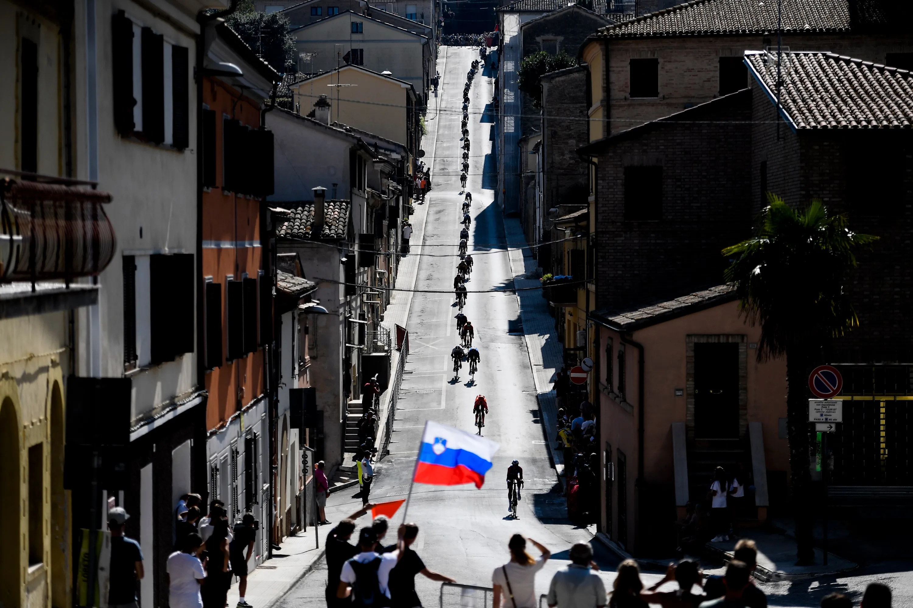 Cyclists compete during the seventh stage of the Tirreno Adriatico cycling race from Pieve Torina to Loreto, Italy, Sunday, September 13, 2020. (Photo by Marco Alpozzi/LaPresse via AP Photo)