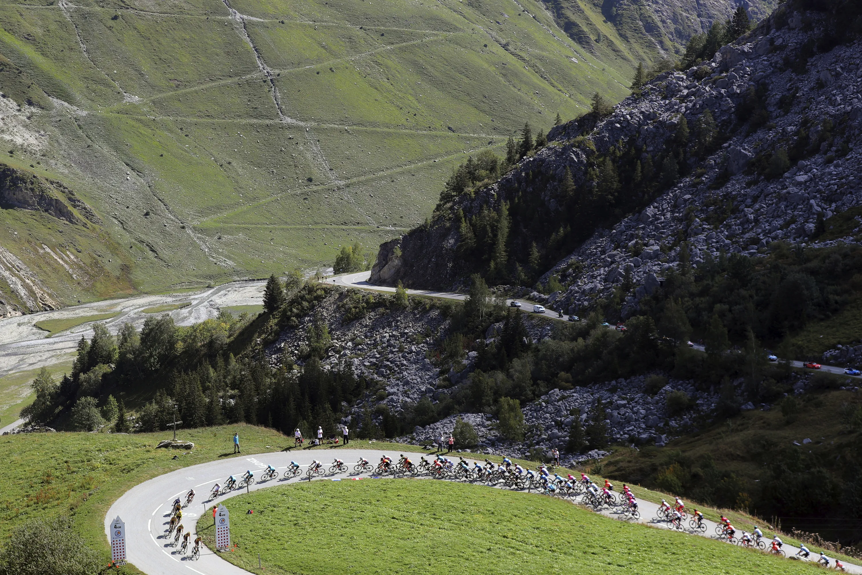 The pack climb Cormet de Roselend during the stage 18 of the Tour de France cycling race over 175 kilometers (108.7 miles) from Meribel to La Roche-sur-Foron, France, Thursday, September 17, 2020. (Photo by Thibault Camus/AP Photo)