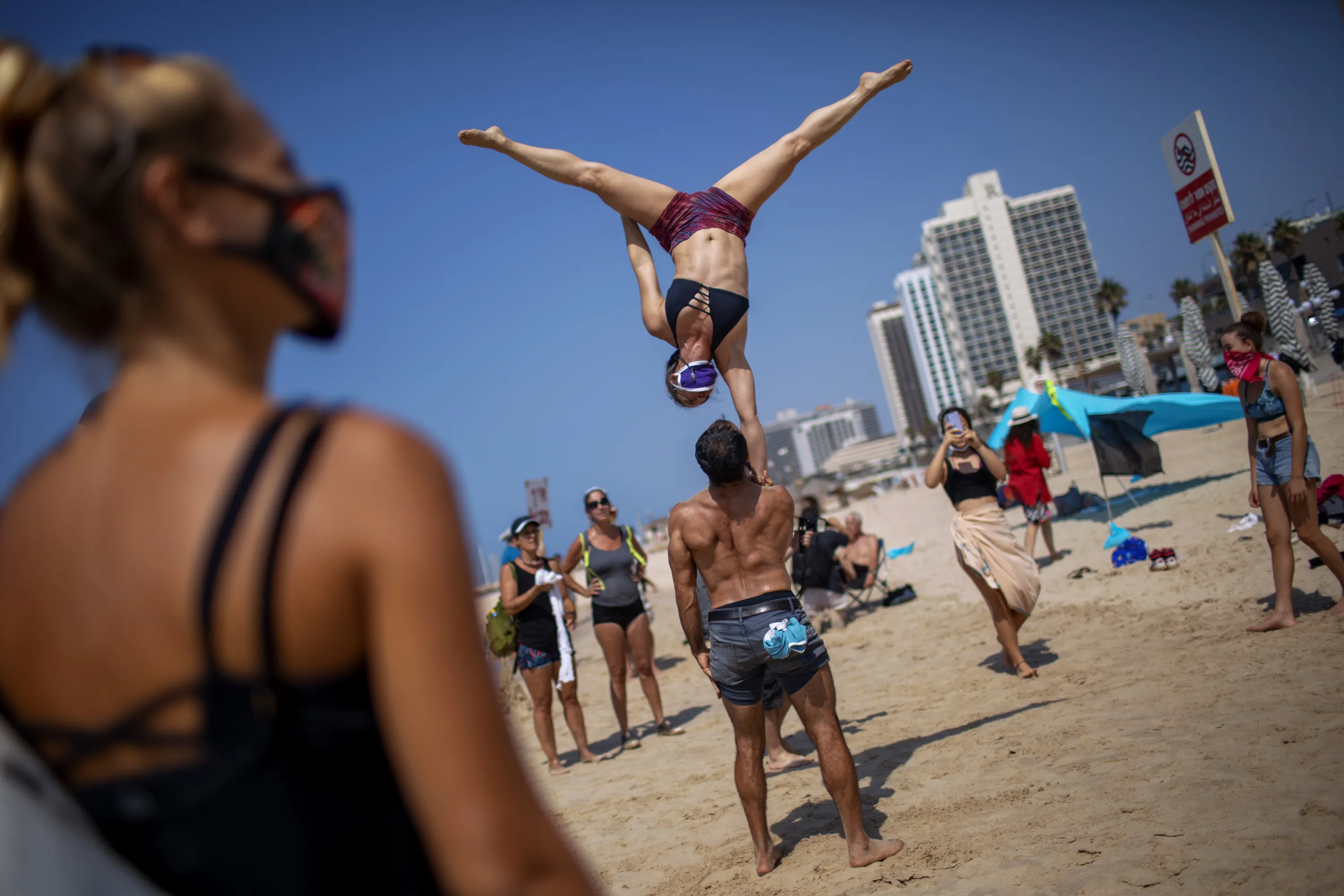 Acrobats perform as they wear face masks during a protest against government's decision to close beaches during the three-week nationwide lockdown due to the coronavirus pandemic, in Tel Aviv, Israel, Saturday, September 19, 2020. Israel went back into a full lockdown on Friday to try to contain a coronavirus outbreak that has steadily worsened for months as its government has been plagued by indecision and infighting. (Photo by Oded Balilty/AP Photo)