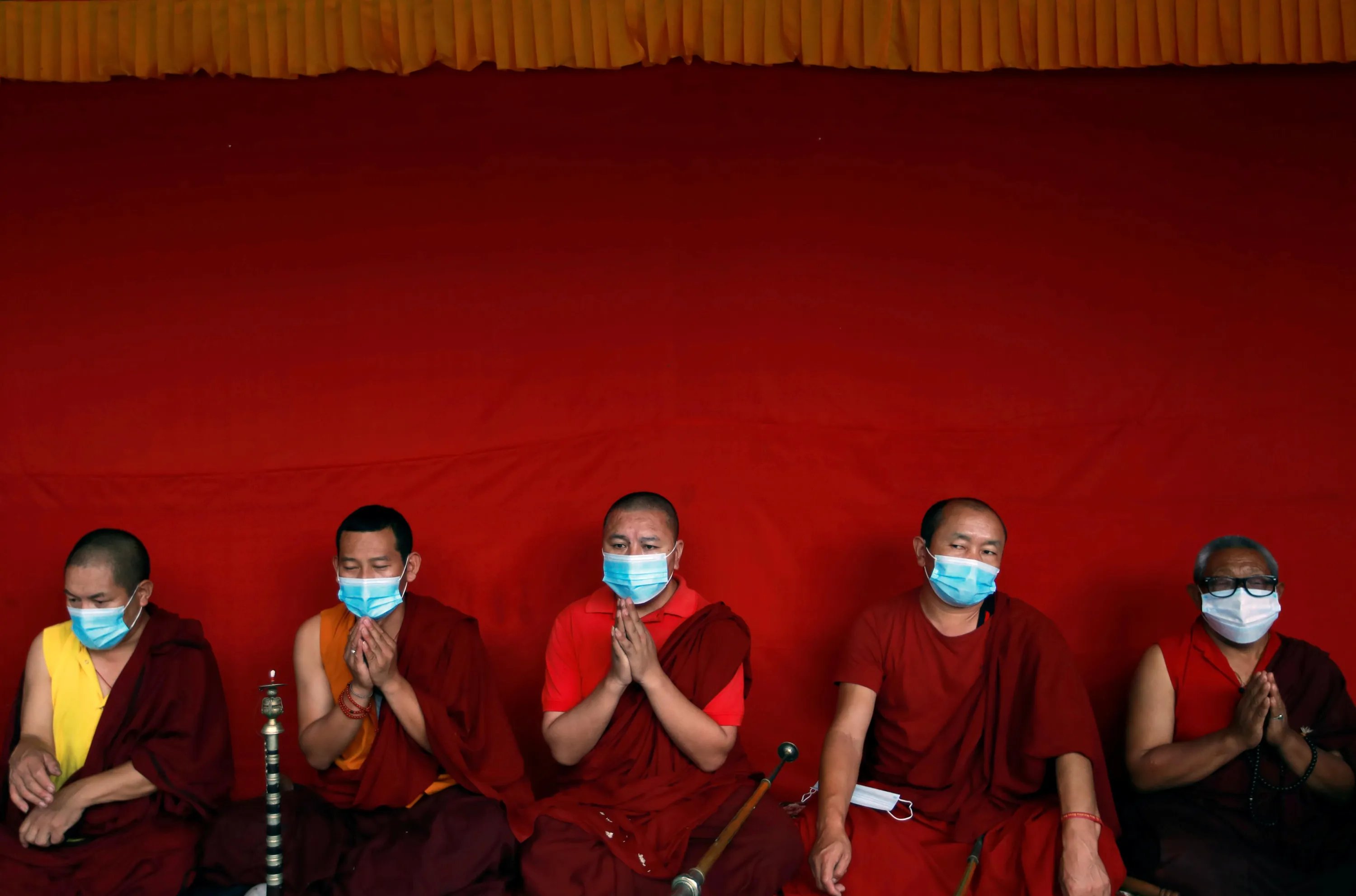 Buddhist monks wearing face masks offer prayer during the funeral procession of Ang Rita Sherpa, the first man to climb Mount Everest 10 times without the use of supplement oxygen, who was also known as the “snow leopard”, in Kathmandu, Nepal, September 23, 2020. (Photo by Navesh Chitrakar/Reuters)