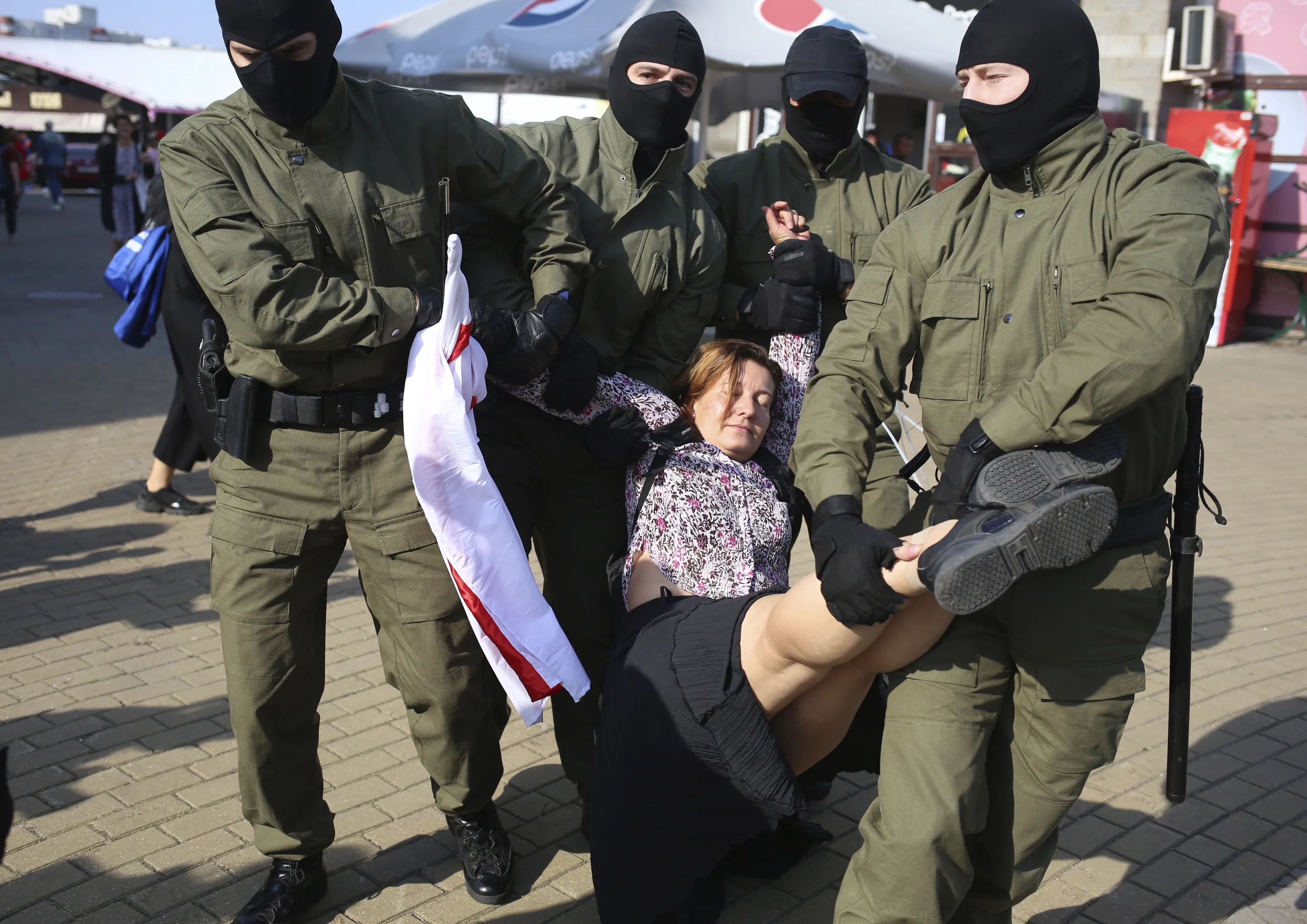 Police officer detain a woman with an old Belarusian national flag during an opposition rally to protest the official presidential election results in Minsk, Belarus, Saturday, September 26, 2020. (Photo by TUT.by via AP Photo)