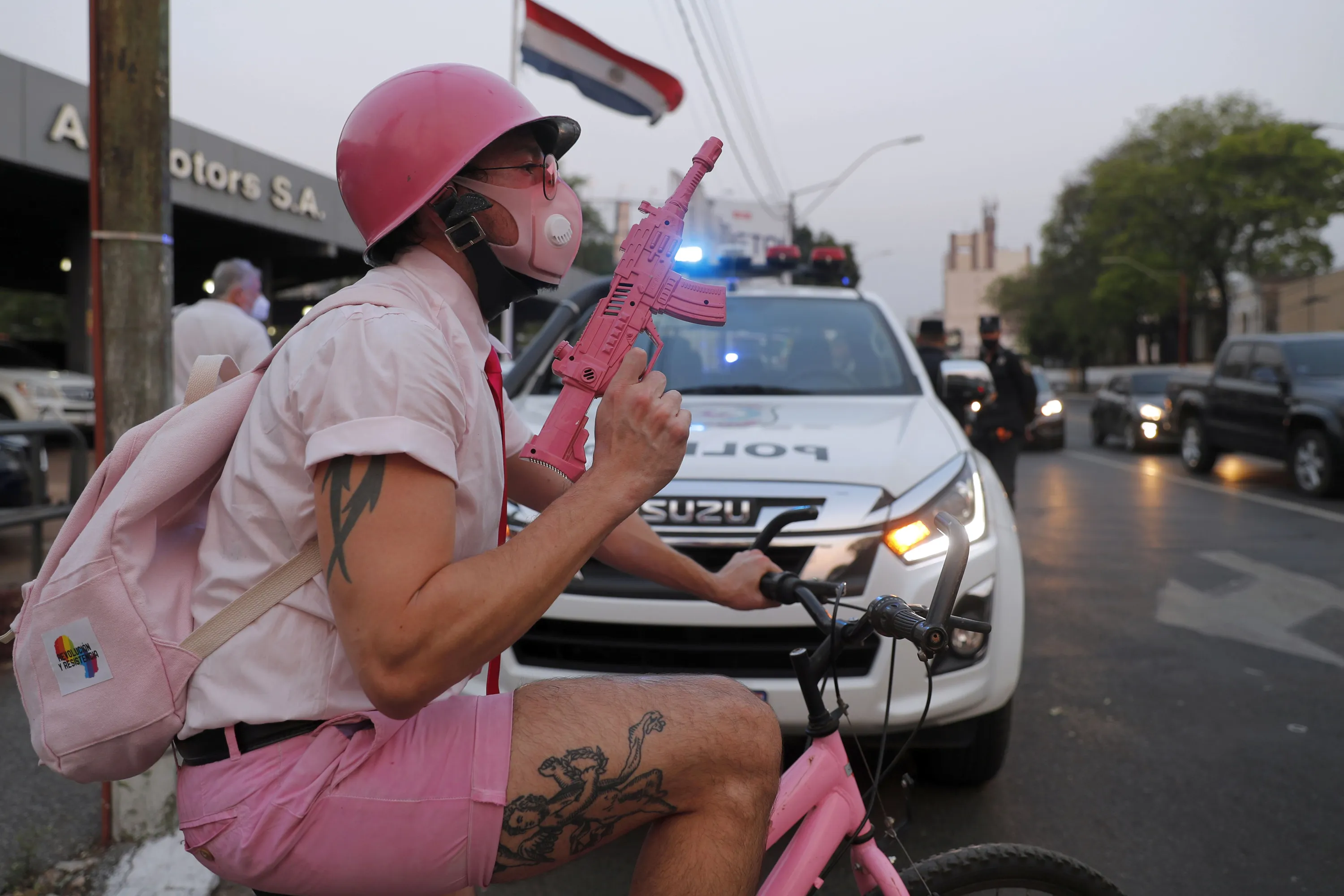 Holding a toy machine gun and wearing a mask to curb the spread of the new coronavirus, a gay man perfoms for peace in front of a police car during a LGTBI Pride caravan in Asuncion, Paraguay, Wednesday, September 30, 2020. LGTBI organizations celebrated their Pride day with a caravan of vehicles because of the ongoing COVID-19 pandemic. (Photo by Jorge Saenz/AP Photo)
