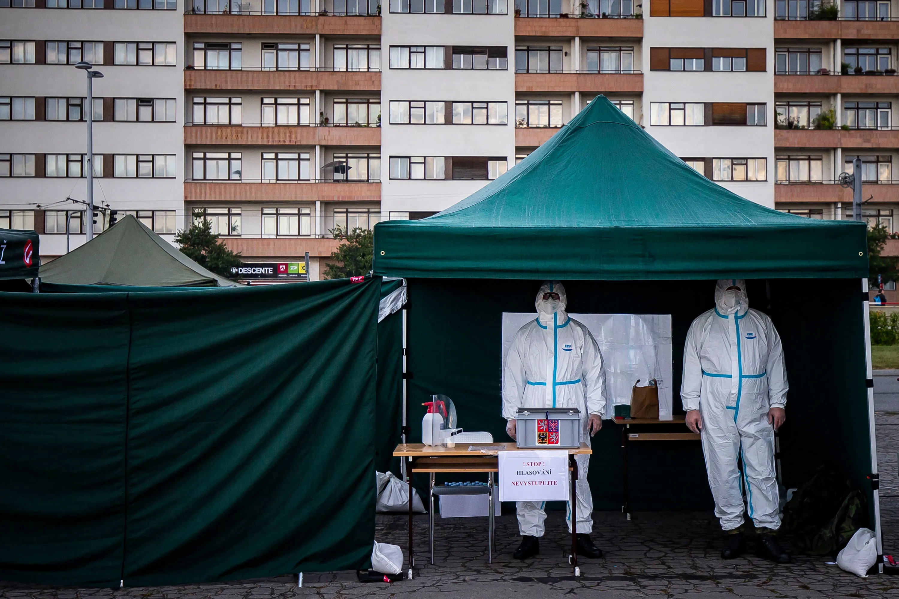 Election committee members wearing a protective suits, wait for voters at a drive-in polling station during regional and senate elections on September 30, 2020 in Prague, Czech Republic. For the country's upcoming regional and senate elections, authorities have created drive-in polling stations for voters required to quarantine amid the Covid-19 pandemic. After initial success in curbing an outbreak, the Czech Republic has seen a surge of Covid-19 cases in recent weeks. (Photo by Gabriel Kuchta/Getty Images)