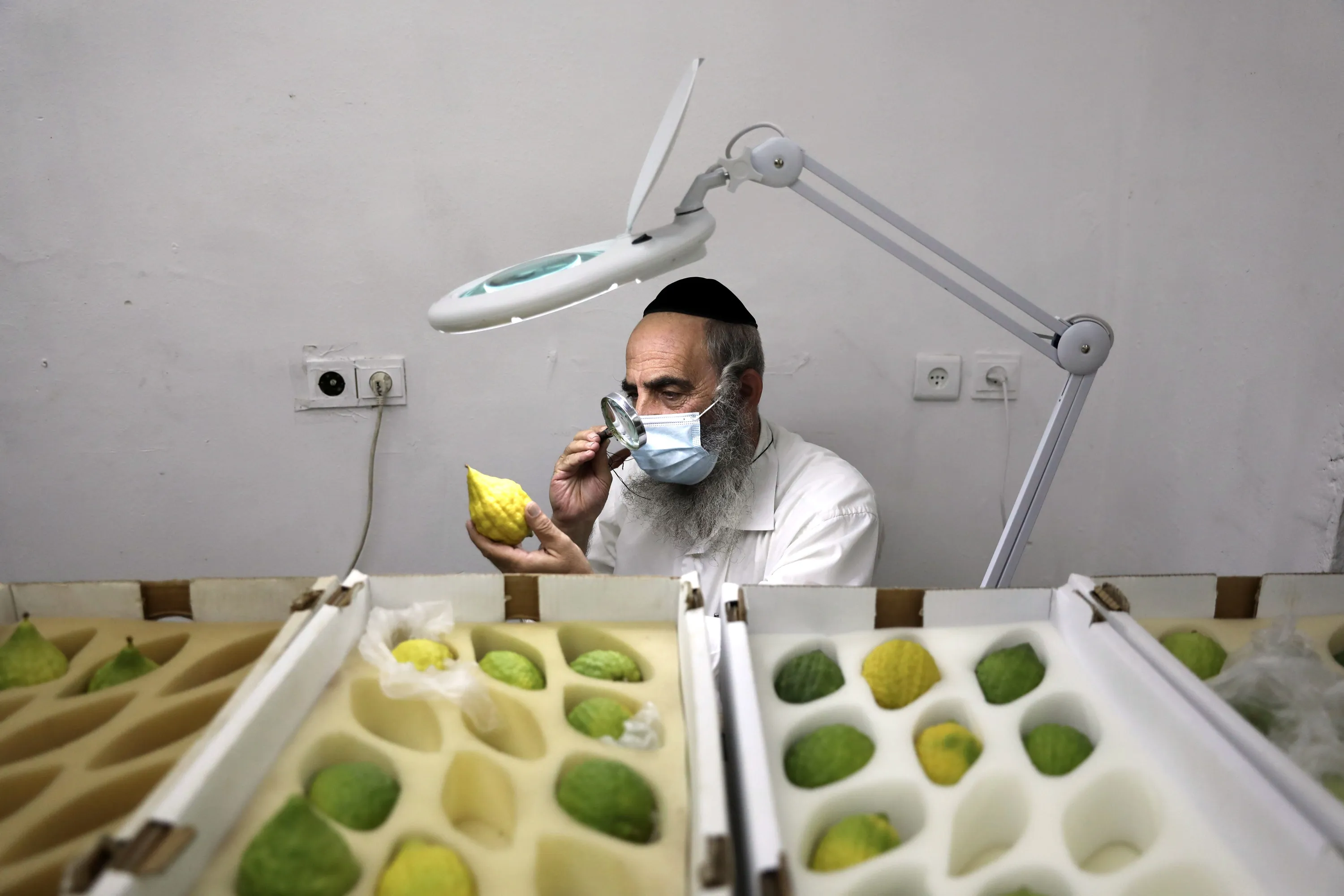 An Ultra-Orthodox Jewish man inspects an Etrog, or yellow citron, used during the celebration of Sukkot, the Feast of the Tabernacles, in the Ultra-Orthodox neighborhood of Mea Shearim, Jerusalem, Israel, 30 September 2020. The Sukkot feast, which begins on 02 October at sunset and end on 09 October, commemorates the exodus of Jews from Egypt some 3,200 years ago. Israel is on a full three-week lockdown during the Jewish holidays aimed to stem a new spike of Covid-19 coronavirus cases. (Photo by Abir Sultan/EPA/EFE)