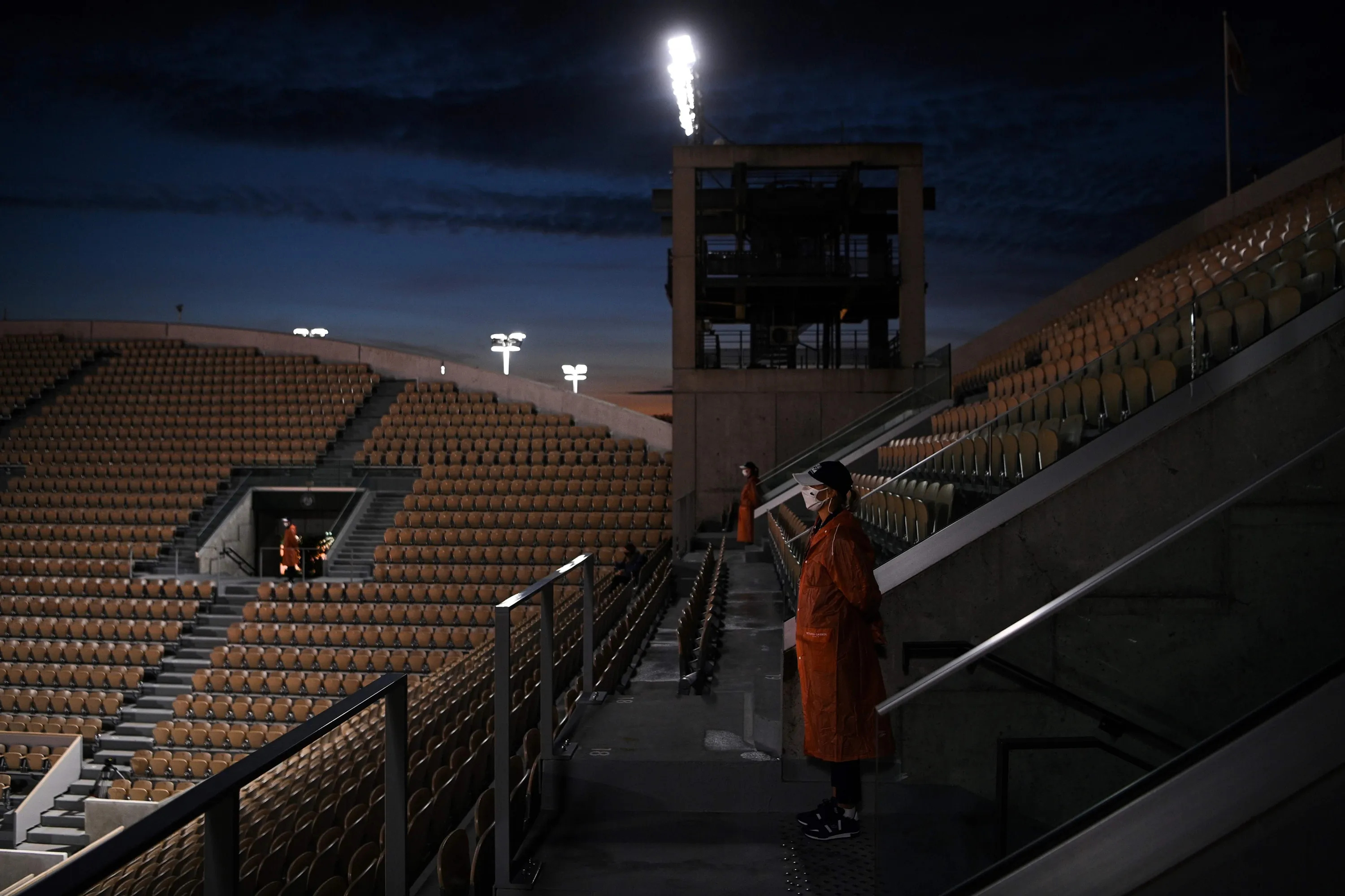Ground staff members stand guard among the empty seats at the Suzanne Lenglen court in the evening on the Day 2 of The Roland Garros 2020 French Open tennis tournament in Paris on September 28, 2020. (Photo by Anne-Christine Poujoulat/AFP Photo)