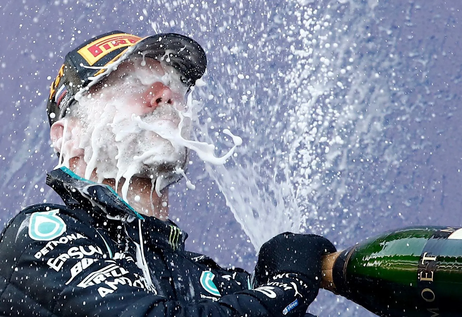 Mercedes' Valtteri Bottas celebrates with sparkling wine on the podium after winning the Formula One Russian Grand Prix at Sochi Autodrom in Sochi, Russia, September 27, 2020. (Photo by Maxim Shemetov/Pool via Reuters)