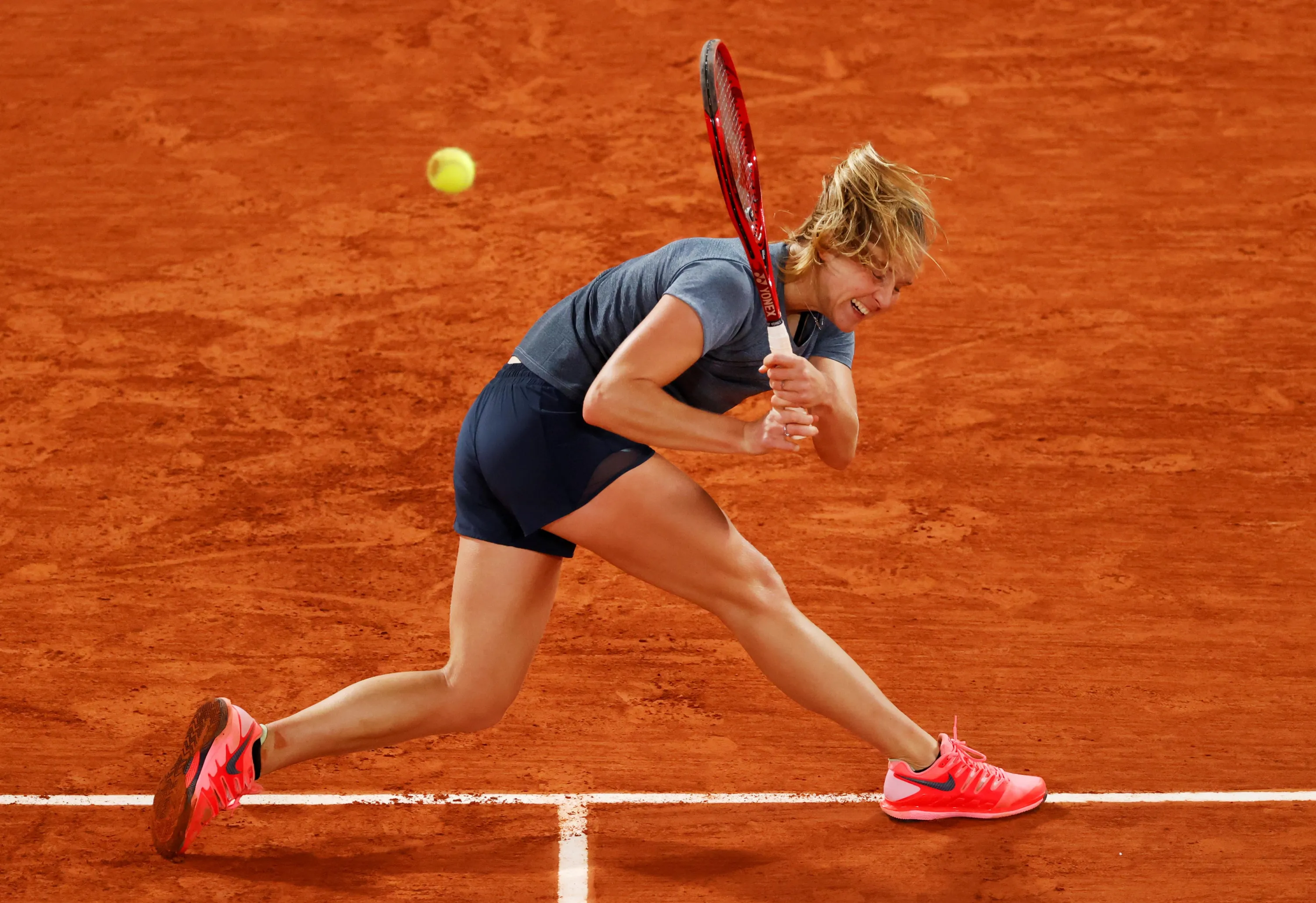 France's Fiona Ferro returns the ball to Sofia Kenin of the US during their women's singles fourth round tennis match on Day 9 of The Roland Garros 2020 French Open tennis tournament in Paris on October 5, 2020. (Photo by Christian Hartmann/Reuters)