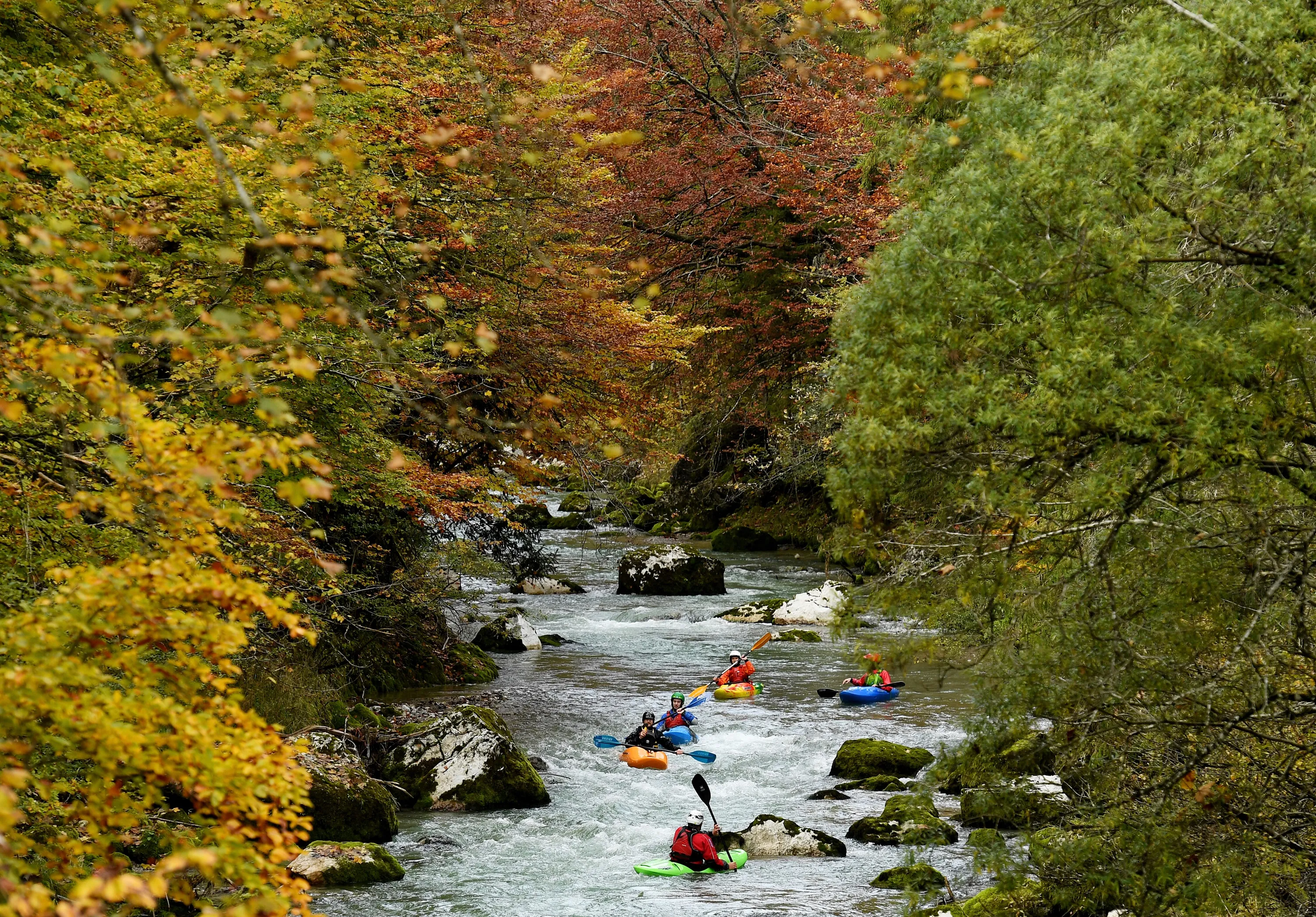 Kayakers paddle along the Loisach river past autumnally coloured deciduous trees in Garmisch-Partenkirchen, Bavaria on October 18, 2020. (Photo by Angelika Warmuth/dpa)
