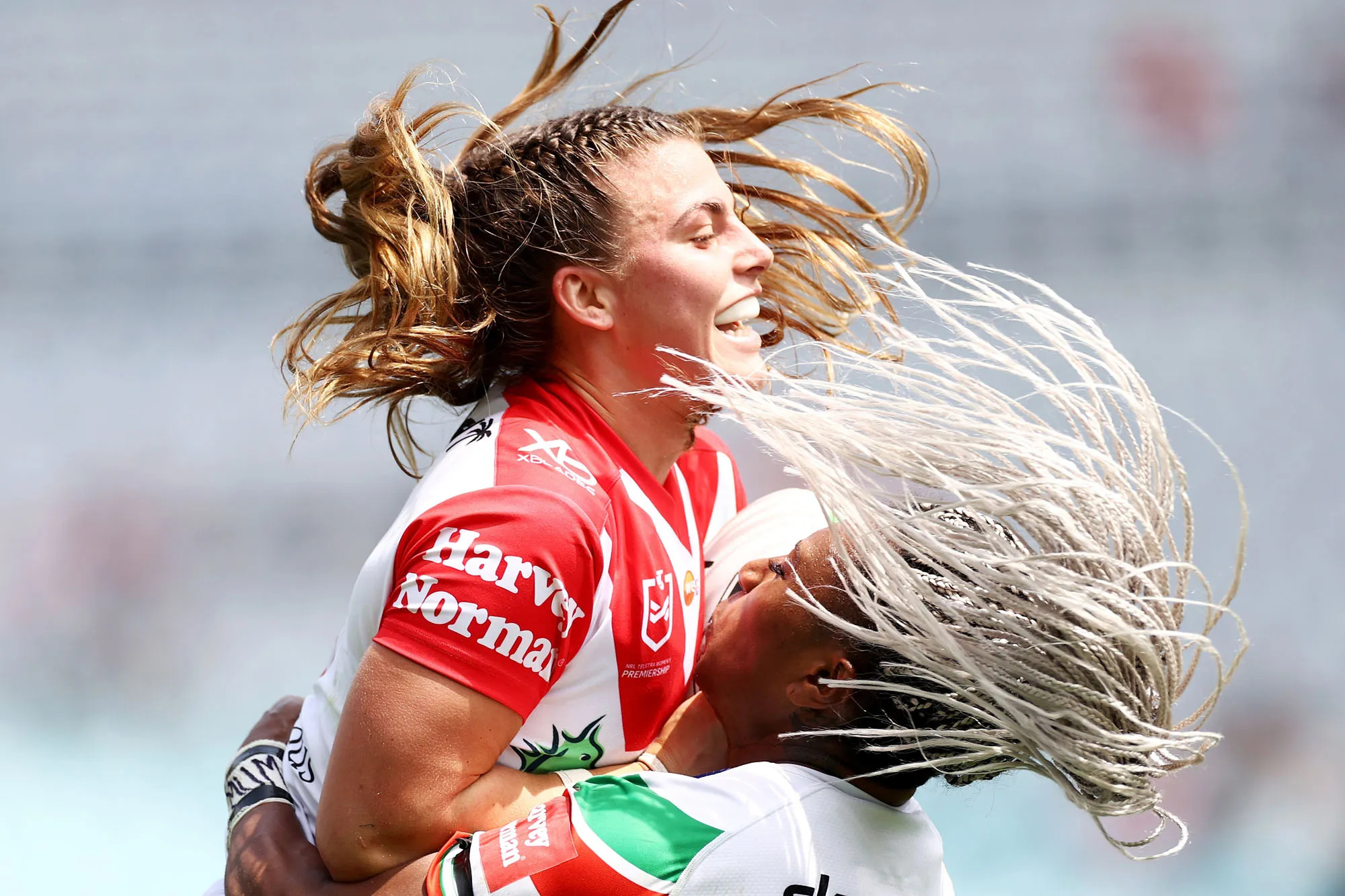 Jessica Sergis of the Dragons is tackled by Ellia Green of the Warriors during the round three NRLW match between the St George Illawarra Dragons and the New Zealand Warriors at ANZ Stadium on October 17, 2020 in Sydney, Australia. (Photo by Cameron Spencer/Getty Images)