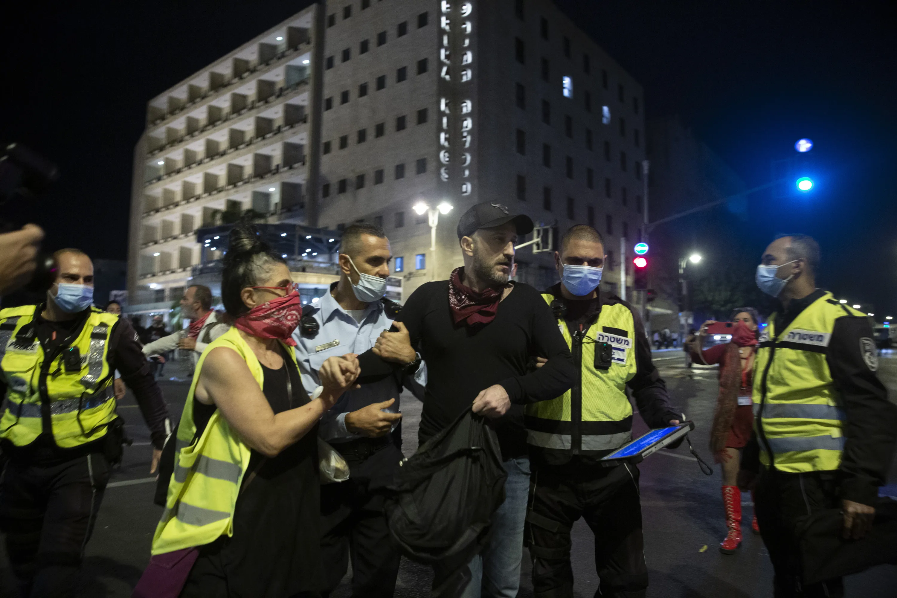 Israeli police remove a protester as they forcibly clear the square outside of Israeli Prime Minister Benjamin Netanyahu's residence in Jerusalem, Saturday, October 24, 2020. (Photo by Maya Alleruzzo/AP Photo)