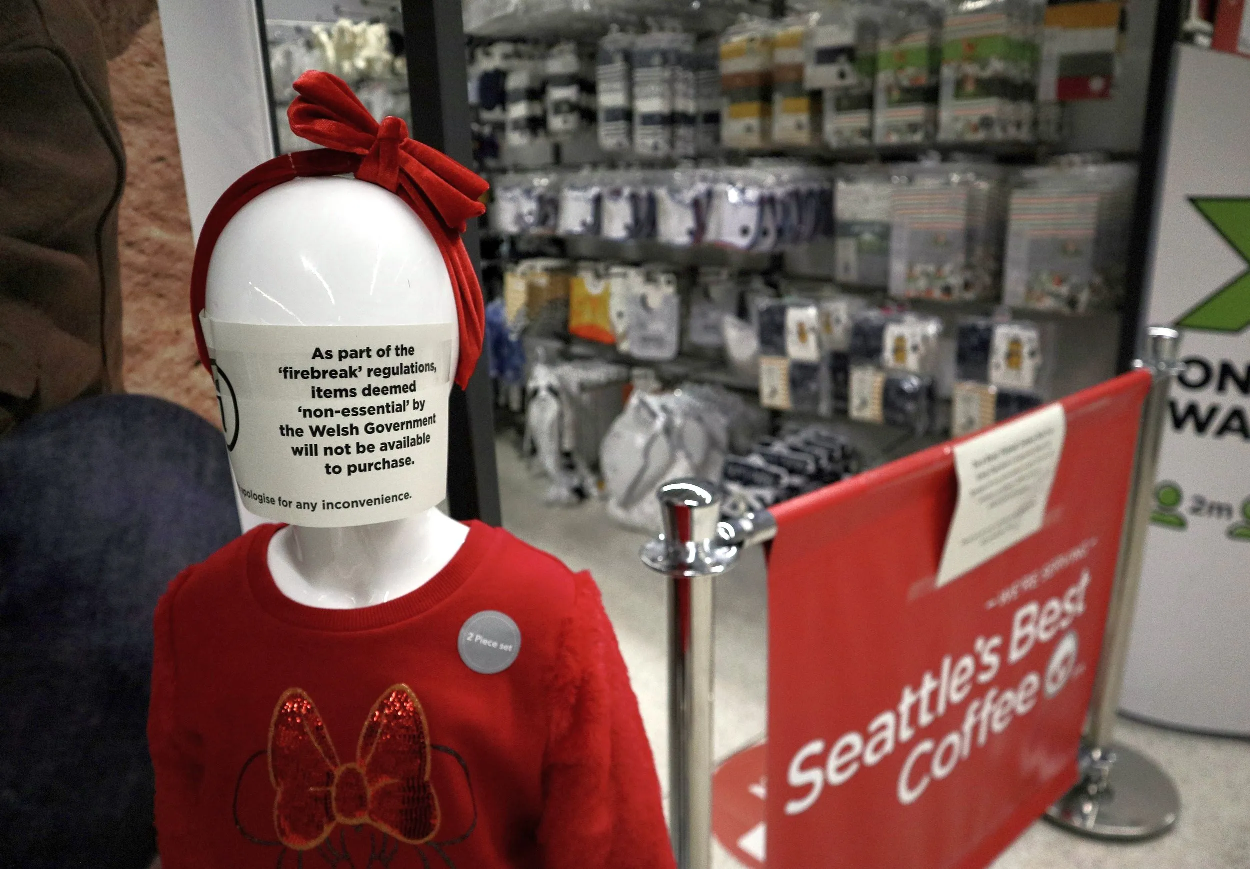 A general view of a supermarket which has used mannequins and advertisements to cordon off non essential goods which are restricted from sale under the Welsh firebreak lockdown restrictions on October 24, 2020 in Blackwood, Wales. (Photo by Huw Fairclough/Getty Images)