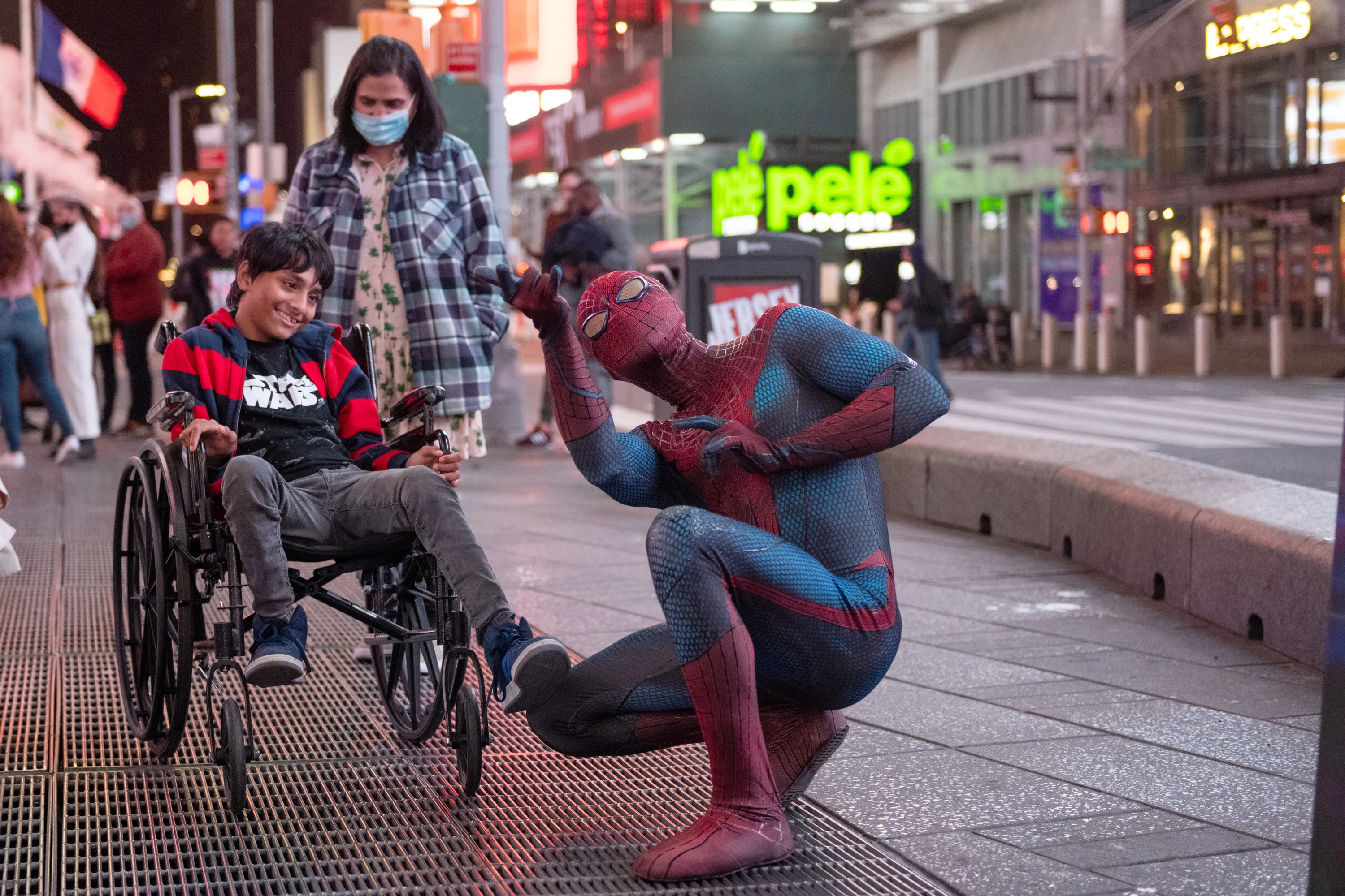 Junaid watches as Andreas Alfaro, dressed in a Spider- Man costume, makes the Spider-Man web shooting hand gesture in Times Square during the Coronavirus pandemic on October 19, 2020 in New York City. (Photo by Alexi Rosenfeld/Getty Images)