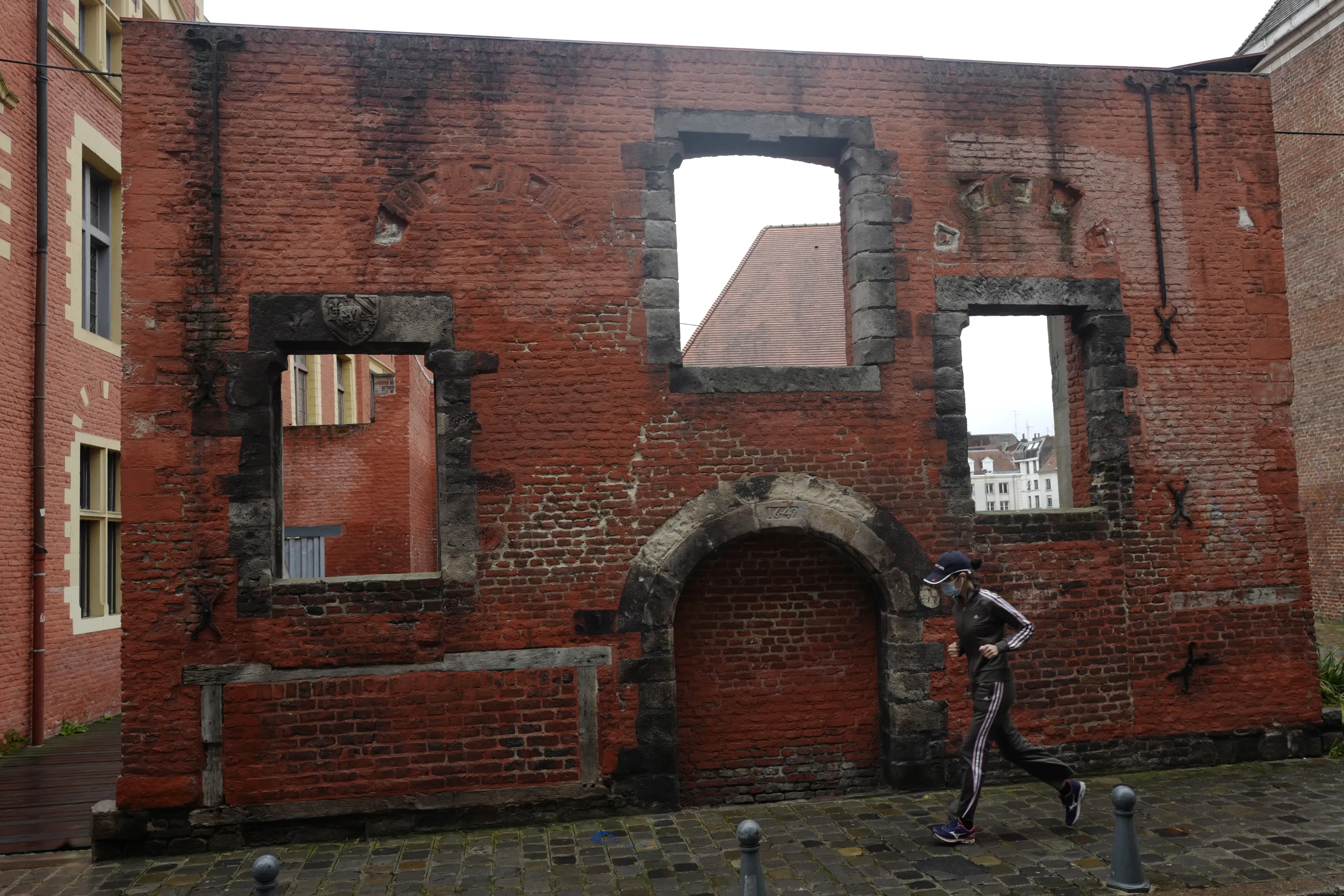 A woman jogs in Lille, northern France, Sunday, November 1, 2020. France re-imposed a monthlong nationwide lockdown Friday aimed at slowing the spread of the virus, closing all non-essential business and forbidding people from going beyond one kilometer from their homes except to go to school or a few other essential reasons. (Photo by Michel Spingler/AP Photo)