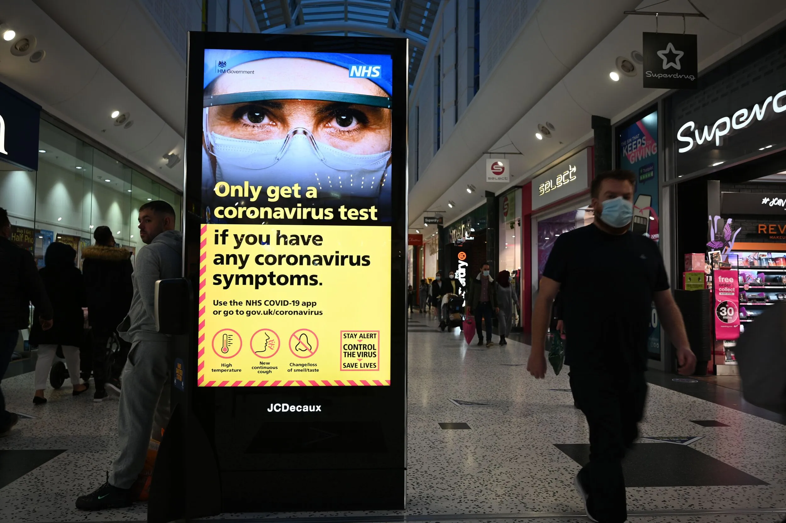 An electronic billboard displays government messages about the coronavirus pandemic in a shopping centre in Leeds, northern England, on November 1, 2020 as England prepares to enter into a second lockdown in an effort to stem soaring infections. A new four-week coronavirus lockdown in England will be extended if it fails to reduce infection rates, the government said Sunday, as it faced criticism over the abrupt decision to shut down again. The second national lockdown, hastily announced late Saturday following warnings hospitals could become overwhelmed within weeks, is set to come into force from Thursday and end on December 2. (Photo by Oli Scarff/AFP Photo)