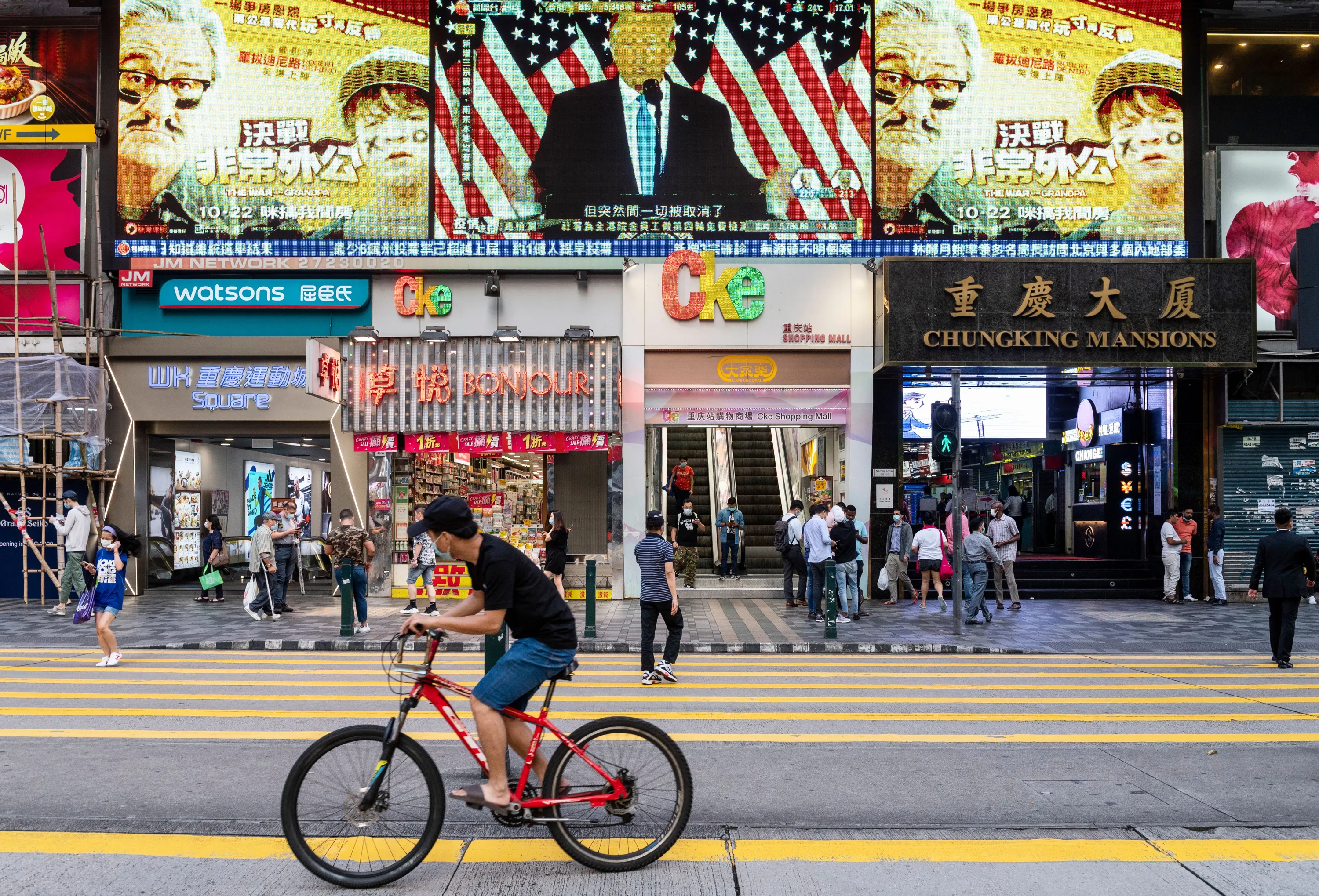 Pedestrians cross the street at a zebra crossing as Republican candidate Donald J. Trump speaks during a live news report about the US presidential election broadcasting on a large screen in Hong Kong on November 4, 2020. (Photo by Miguel Candela/SOPA Images/Rex Features/Shutterstock)
