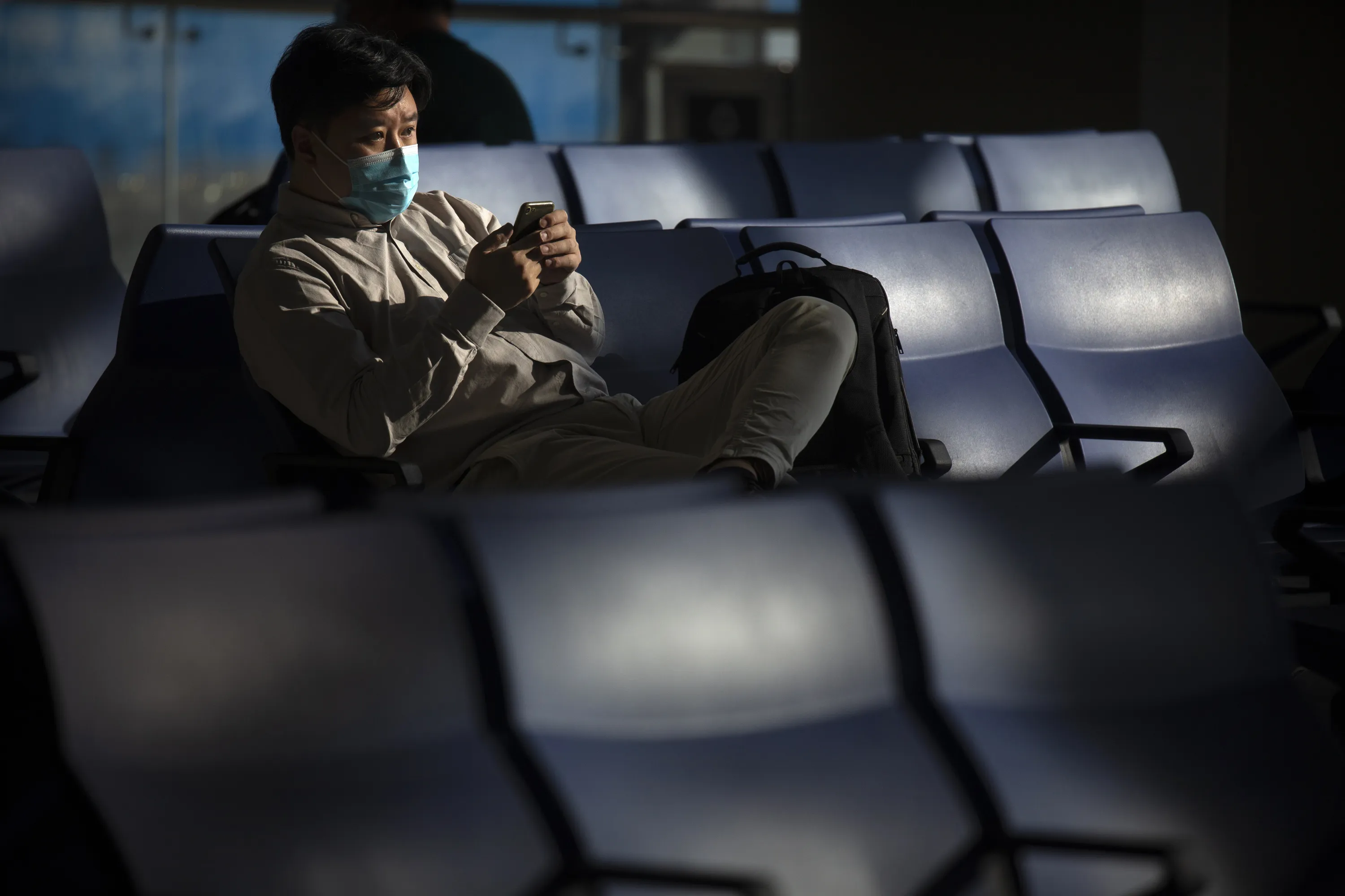 A traveler wearing a face mask to protect against the coronavirus sits at a boarding gate at the Shanghai Hongqiao International Airport in Shanghai, Friday, November 6, 2020. With the COVID-19 outbreak largely under control within its borders, air travel in China has mostly returned to pre-pandemic levels. (Photo by Mark Schiefelbein/AP Photo)