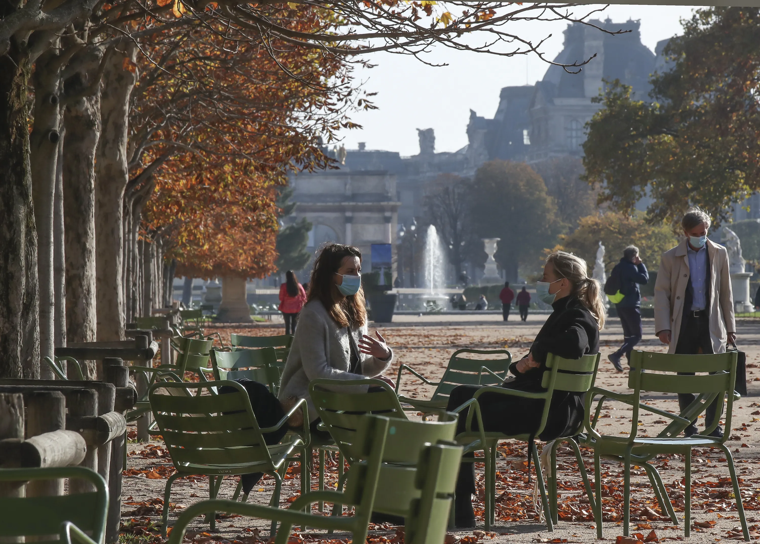 Women wearing face masks as a precaution against the coronavirus sit at the Tuileries garden in Paris, Friday, November 6, 2020. The French government is supplying quick virus tests to nursing homes around the country, amid sharply rising numbers of virus infections and deaths in care homes in recent weeks. The Louvre in the background. (Photo by Michel Euler/AP Photos)