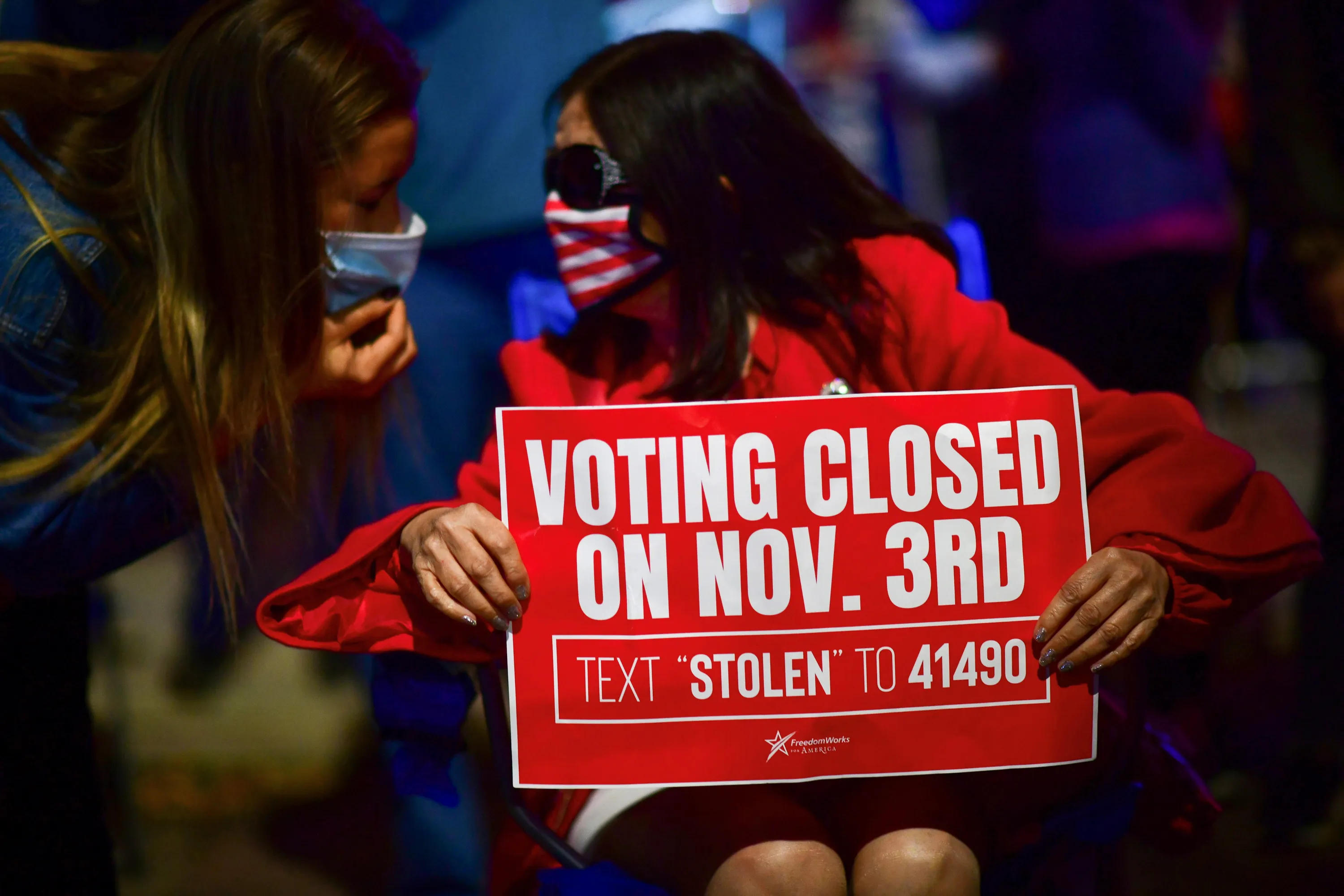 A Trump supporter holds a sign during a protest outside of the Philadelphia Convention Center, where votes are still being counted two days after the 2020 U.S. presidential election, in Philadelphia, Pennsylvania, November 5, 2020. (Photo by Mark Makela/Reuters)