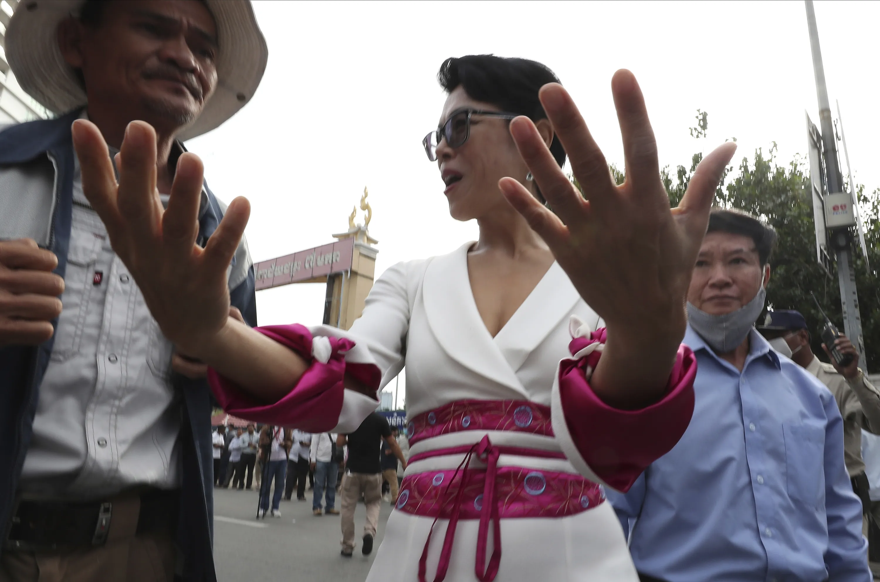 Theary Seng, center, a Cambodian-American lawyer gestures as she enters the Phnom Penh Municipal Court, in Phnom Penh, Cambodia, Thursday, November 26, 2020. A Cambodian court on Thursday began hearing the cases of nearly 130 opponents and government critics charged with treason for taking part in nonviolent political activities over the past three years, in what one of them described as a sham trial. Theary Seng, who has long been one of the most outspoken critics of Hun Sen and his government, is one of the best known defendants living in Cambodia. (Photo by Heng Sinith/AP Photo)