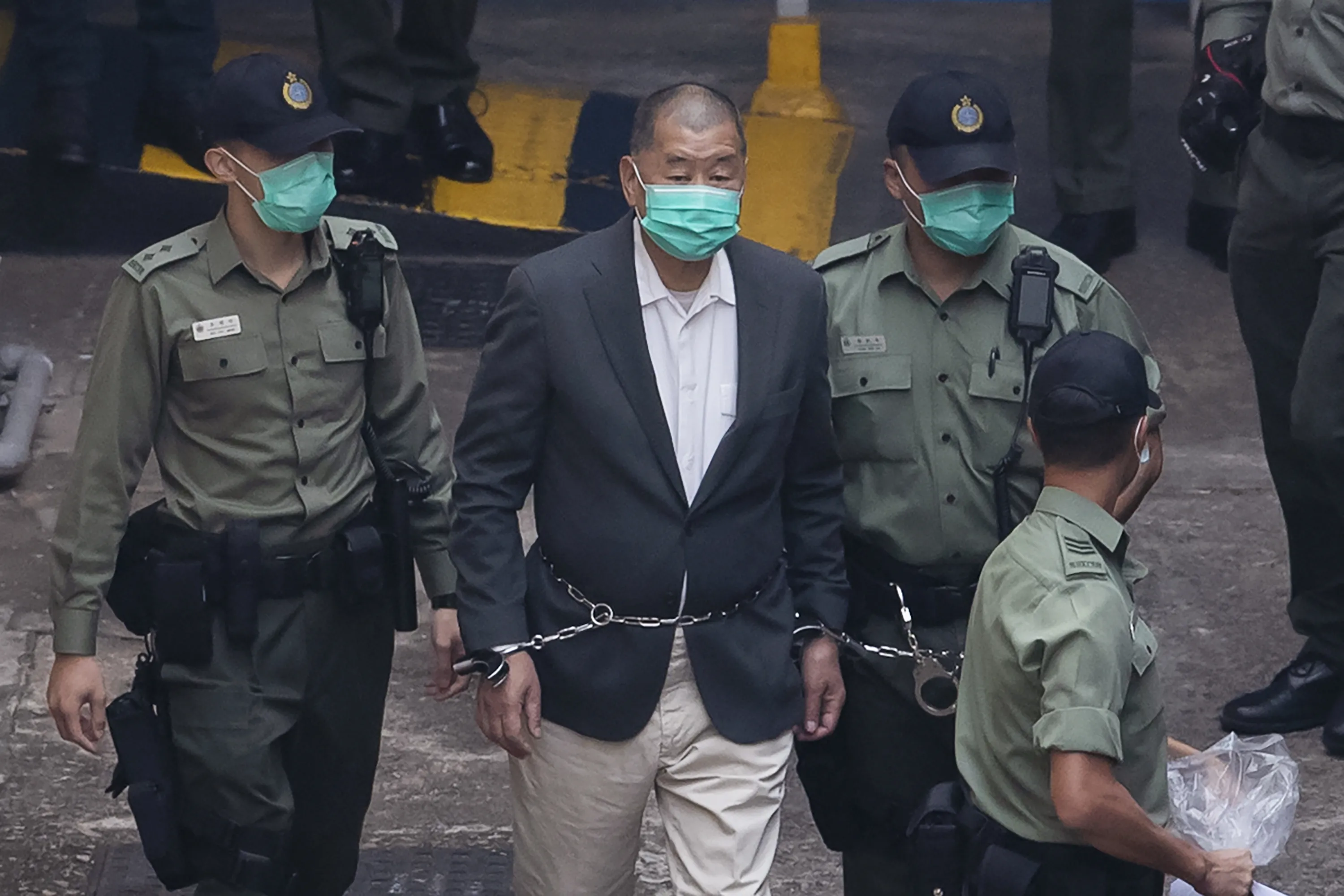 Hong Kong pro-democracy activist and media tycoon Jimmy Lai is escorted by Correctional Services officers to get on a prison van before appearing in a court, in Hong Kong, Saturday, December 12, 2020. Lai, who founded the Apple Daily tabloid, has been charged under the city’s national security law, amid a widening crackdown on dissent, according to local media reports. (Photo by Kin Cheung/AP Photo)