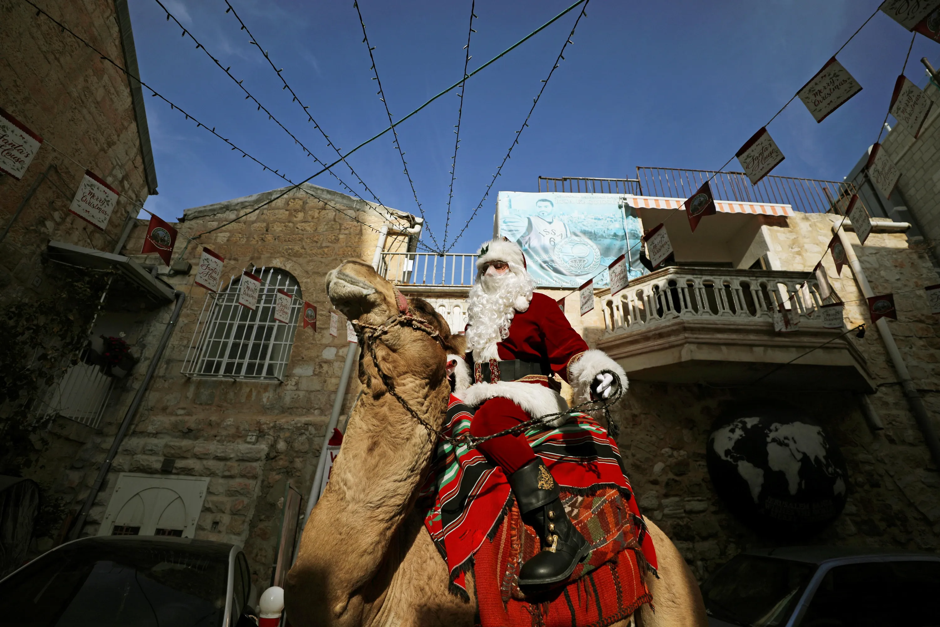 Issa Kassissieh wears a Santa Claus costume as he rides a camel after handing out Christmas trees to people during the annual distribution of the trees organized by the Jerusalem municipality in Jerusalem's Old City on December 22, 2020. (Photo by Ammar Awad/Reuters)