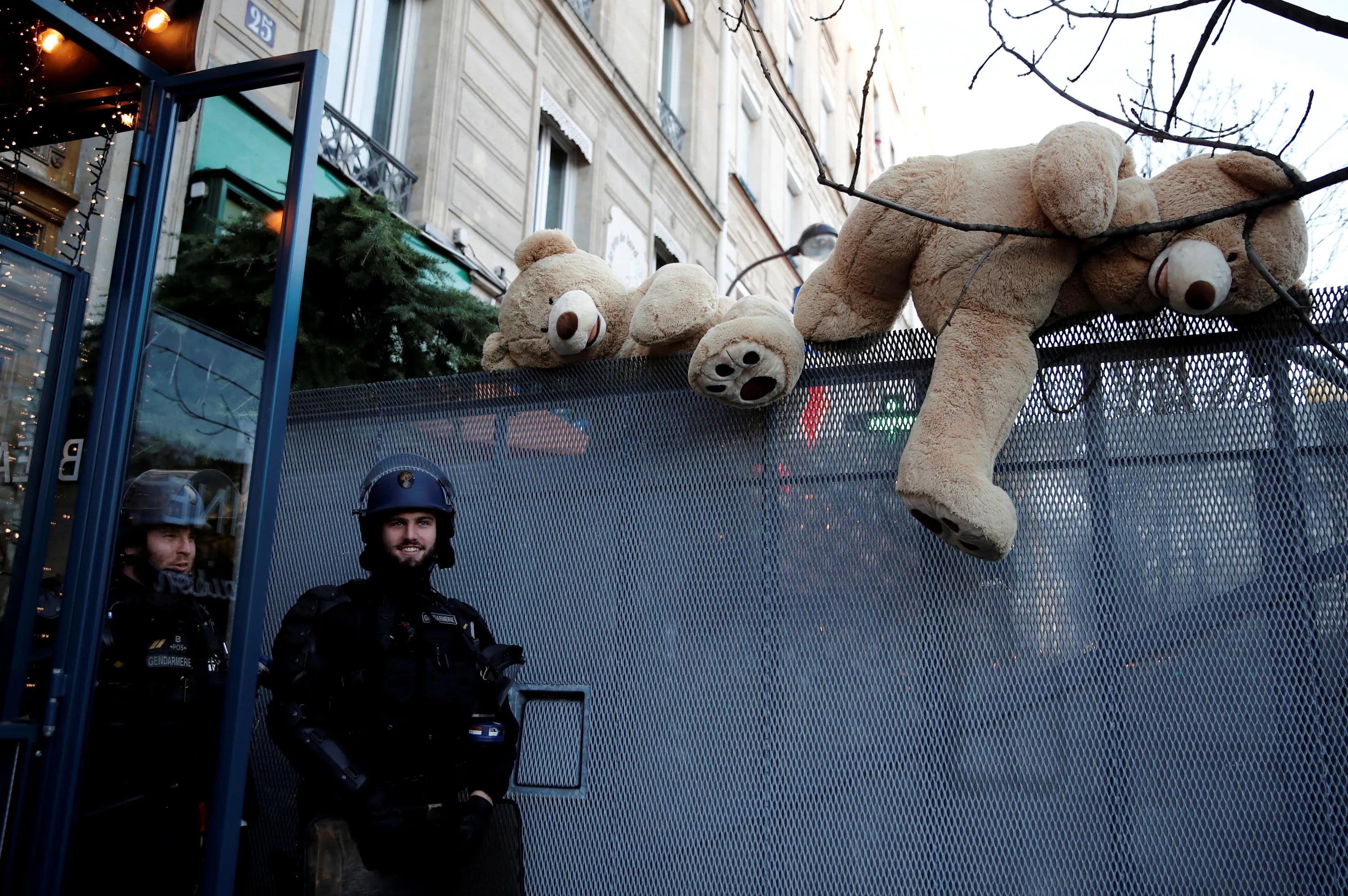 Honey-colored giant teddy bears are seen near French police during a demonstration against French government's pensions reform plans in Paris as France faces its 43rd consecutive day of strikes on January 16, 2020. (Photo by Benoit Tessier/Reuters)