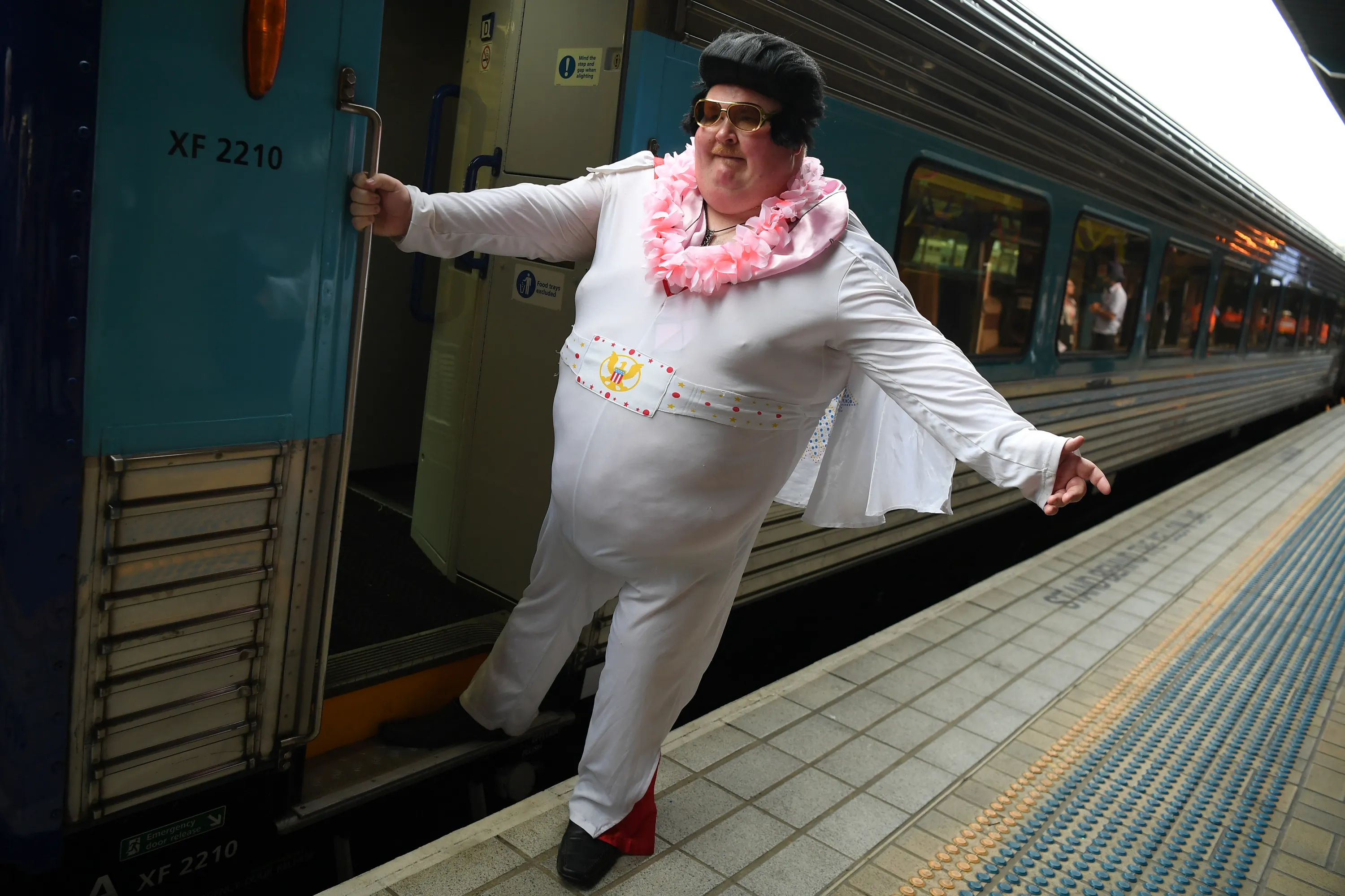 Sean Wright poses for a photo before boarding the Elvis Express, bound for Parkes for the Elvis festival, at Central Station in Sydney, Australia, January 9, 2020. (Photo by Dean Lewins/AAP Image via Reuters)