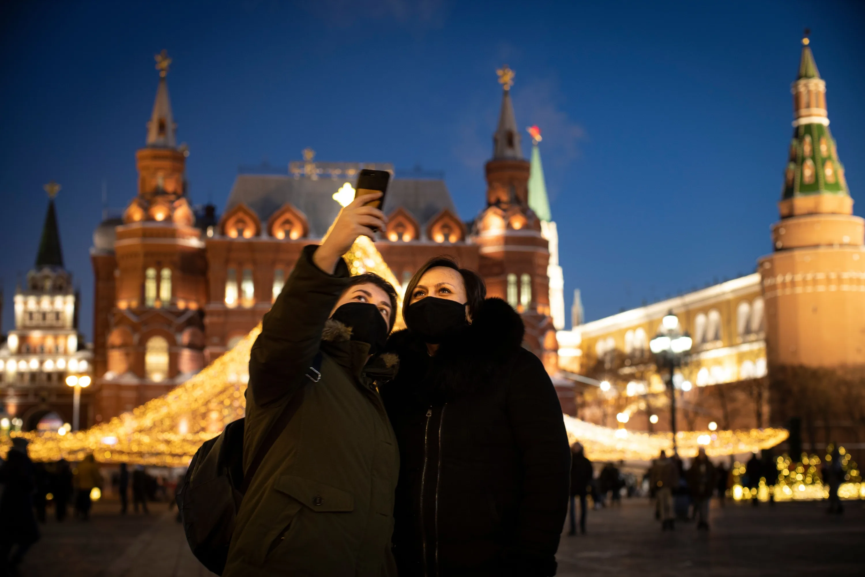 A couple, both wearing face masks to protect against coronavirus pose for a selfie in Manezhnaya Square decorated for Christmas and New Year celebrations, but without the Christmas Market due to the virus-related restrictions, near Red Square with the Historical Museum and the Kremlin Wall in the background in Moscow, Russia, Monday, December 28, 2020. Russian authorities have reported over 3 million confirmed coronavirus infections, the fourth highest caseload in the world, and more than 55,000 deaths. The country's authorities have resisted imposing a second nationwide lockdown or a widespread closure of businesses. (Photo by Alexander Zemlianichenko/AP Photo)