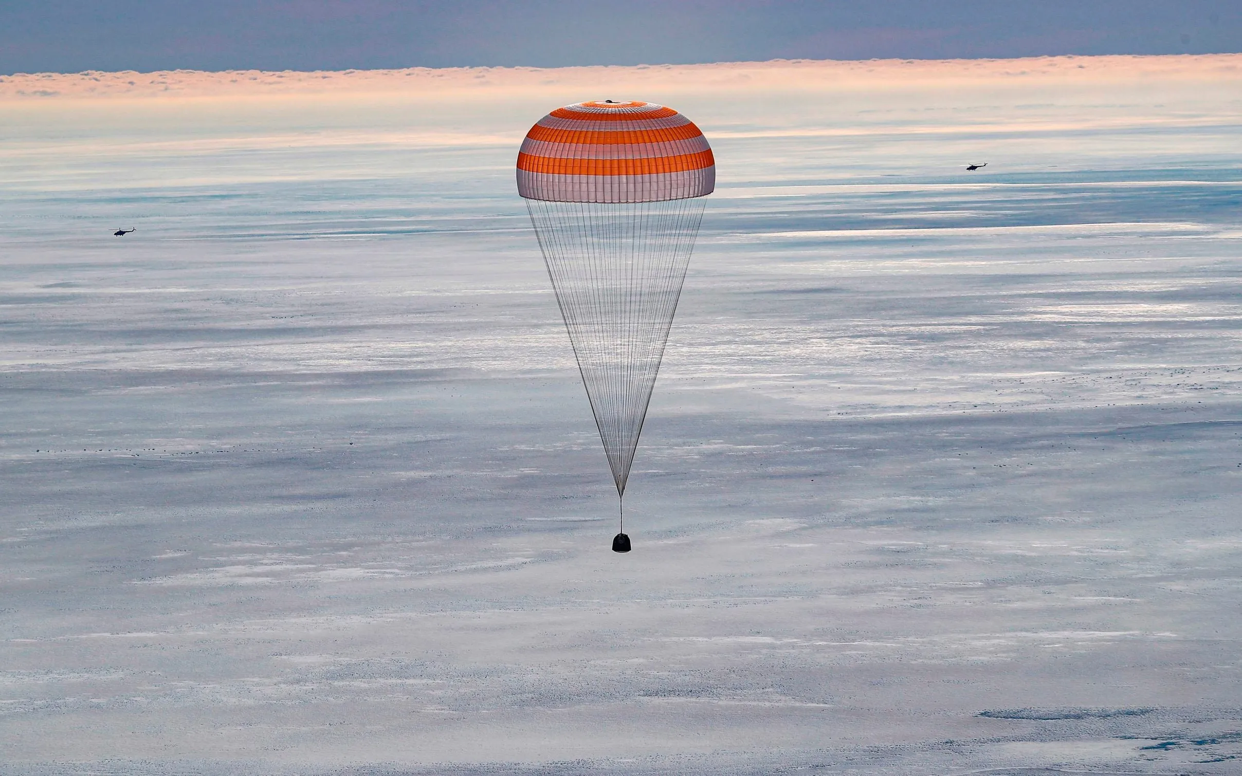 The Soyuz MS-13 capsule carrying the International Space Station (ISS) crew of NASA astronaut Christina Koch, Russian cosmonaut Alexander Skvortsov and Luca Parmitano of the European Space Agency, descends beneath a parachute before landing in a remote area outside the town of Dzhezkazgan (Zhezkazgan), Kazakhstan, on February 6, 2020. (Photo by Sergei Ilnitsky/Pool via AFP Photo)
