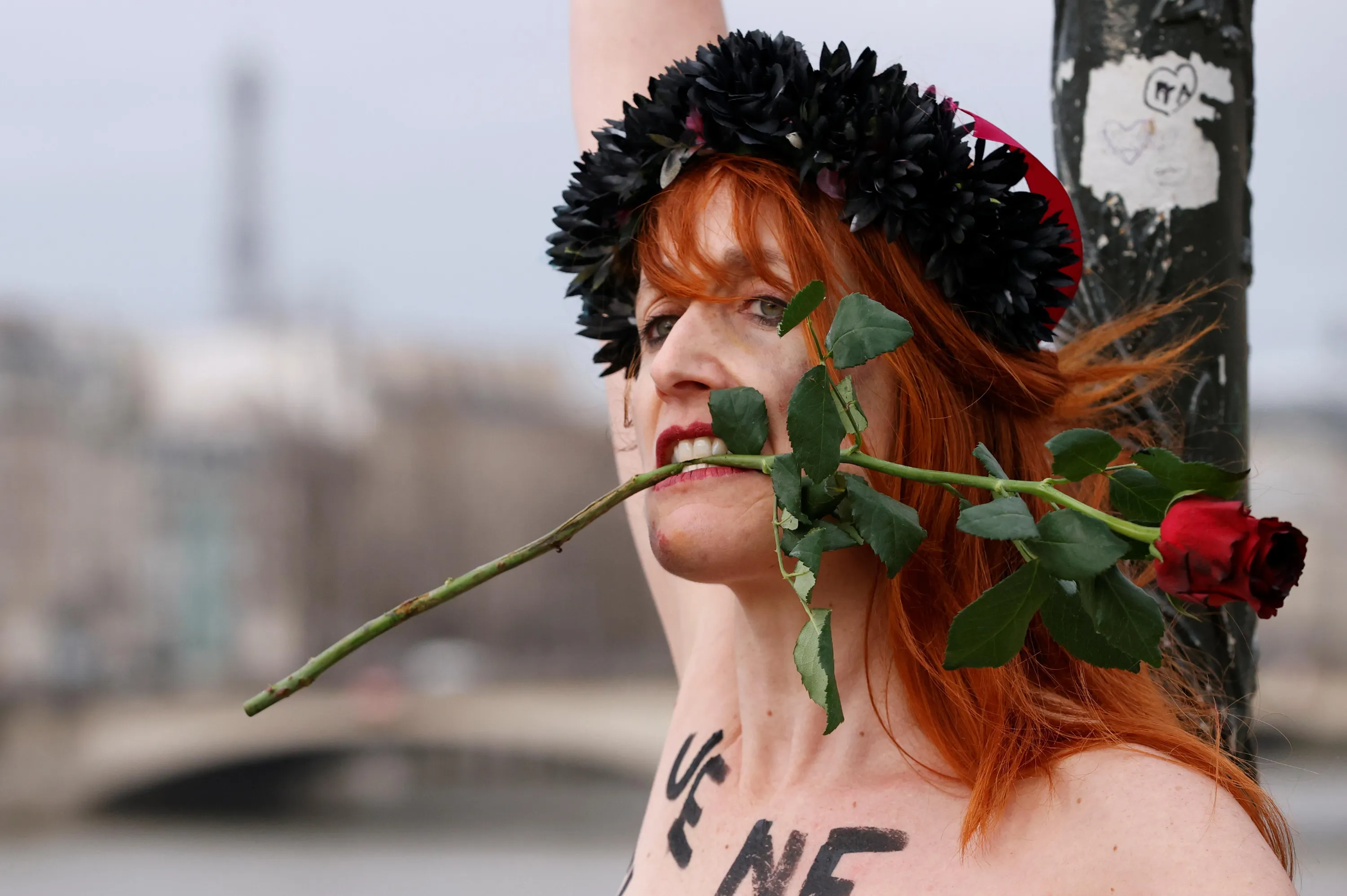 A Femen activist stages an action on the Pont des Arts to protest violence against women on Valentine's Day in Paris, France, February 14, 2020. (Photo by Christian Hartmann/Reuters)
