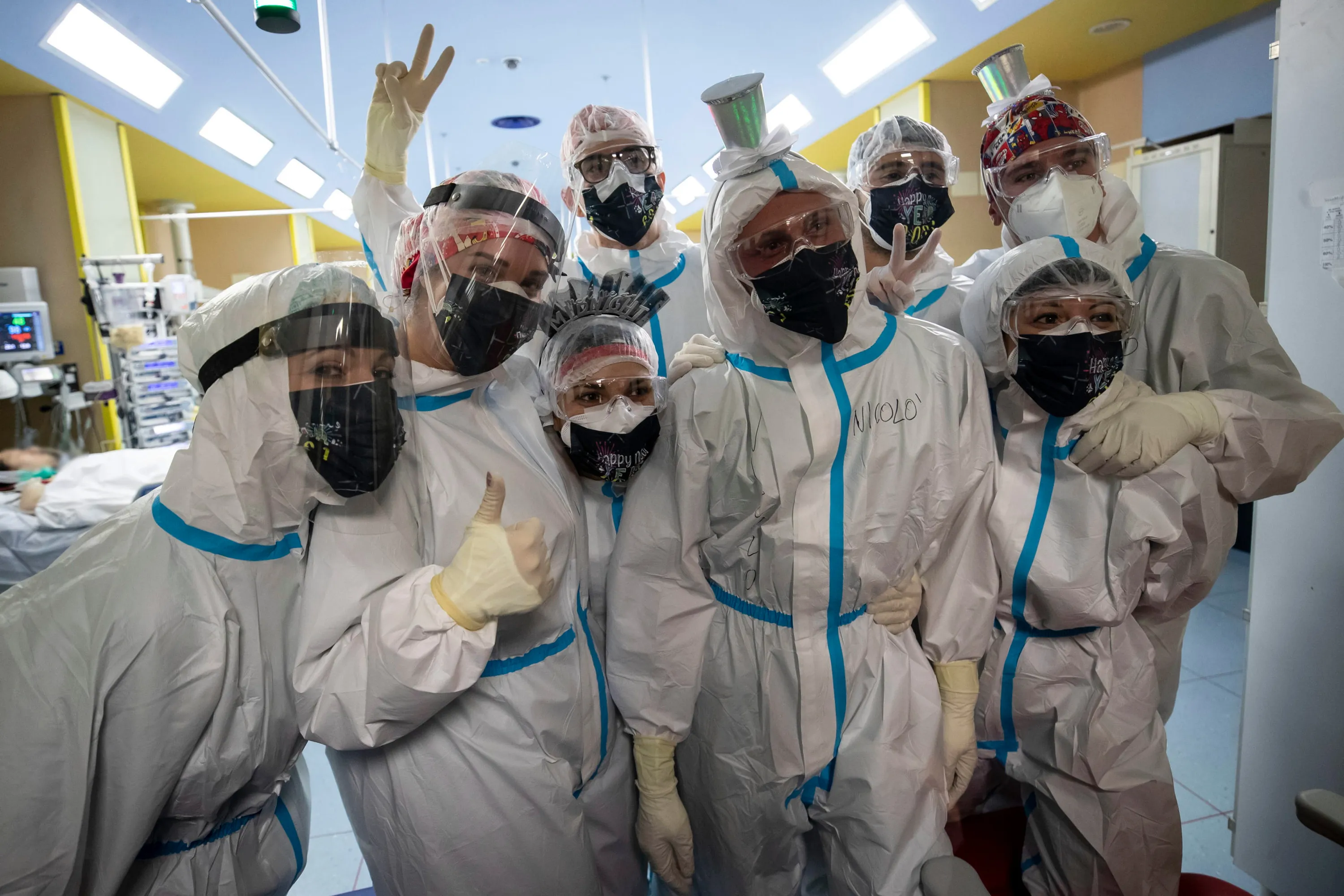 Medical staff of the COVID-19 ward celebrate the new year in Umberto I hospital, in Rome, Italy, 01 January 2021. Italy marks the New Year in “red zone” lockdown with a curfew from 10 pm to 7 am and New Year's Eve parties banned as part of efforts put in place to curb the spread of the coronavirus disease. (Photo by Massimo Percossi/EPA/EFE)
